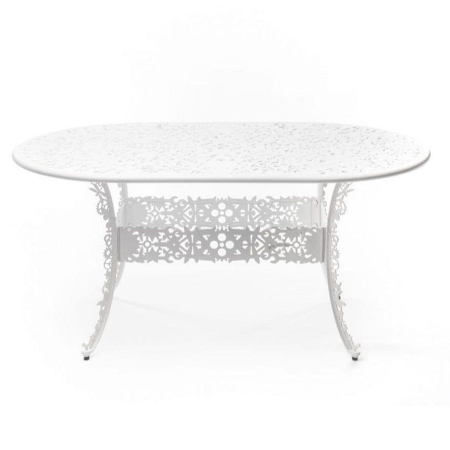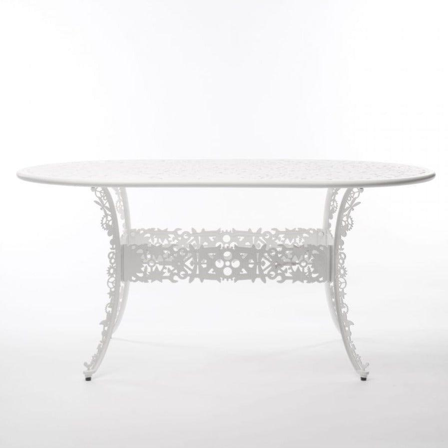 Výnimočný stôl záhradný v štýle viktoriánskej éry v novom, avantgardnom prevedení je dielom talianskej značky Seletti. Opierka a sedadlo skrývajú množstvo nezvyčajných vzorov, ako sú ozubené kolesá či kvety, čo dodáva celku jedinečný charakter.