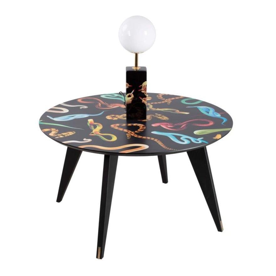Dizajnový stôl v štýle 70. rokov, ktorý ako brána do iného, surrealistického rozmeru, dodá interiéru jedinečný charakter. Šikmé nohy a mierne kontroverzný koláž na doske vytvárajú originálne umelecké dielo. Bolvyrobený v Taliansku, čo zaručuje vysokú kvalitu.
