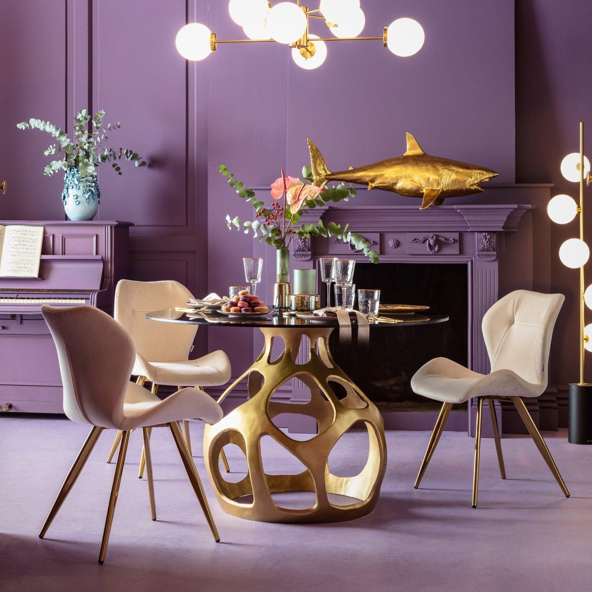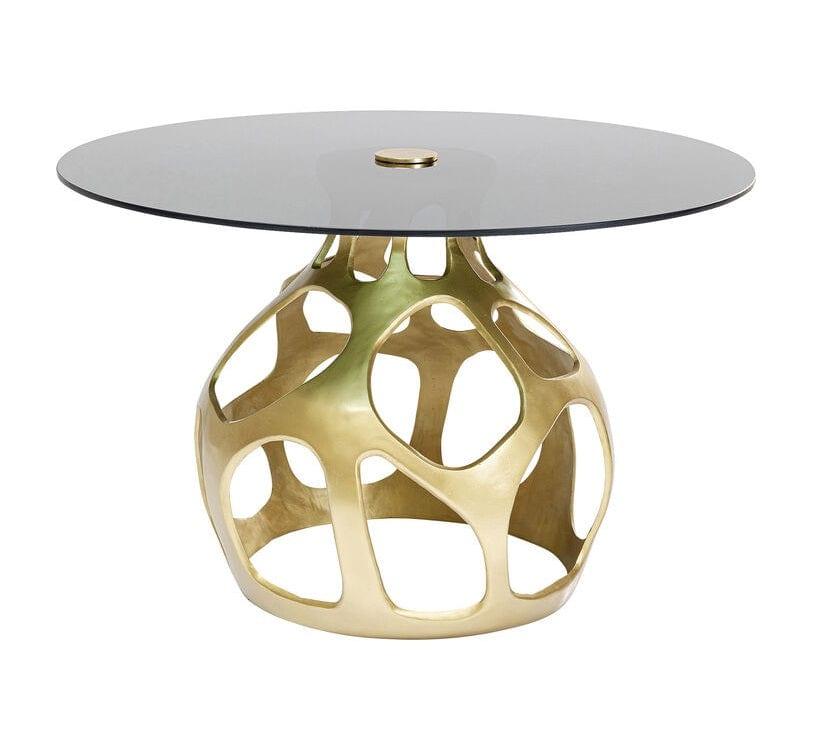 Designerský stôl Volcano je dielom súčasného umenia, ktoré premení váš interiér na jedinečné miesto. Elegantné spojenie zlatej základne a dymového skleneného vrchu sa ideálne hodí do jedálne alebo obývacej izby.