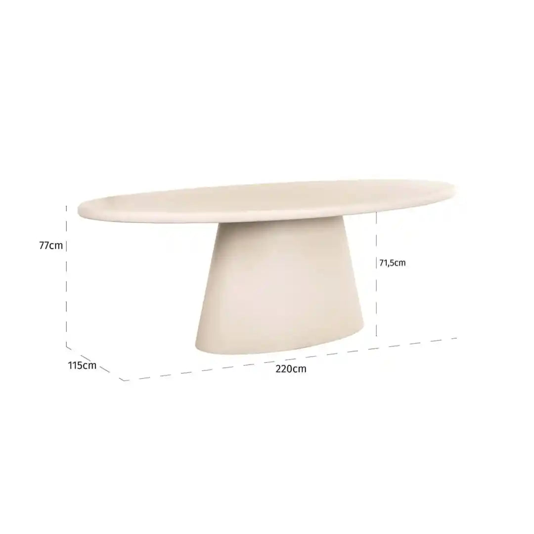Moderný oválny stôl Clayton je kombináciou výnimočného dizajnu a funkčnosti, ktorá sa dokonale hodí do elegantných interiérov. Jeho hladký tvar spôsobuje, že stôl vyzerá ľahko, a zároveň impozantne, pričom je centrálnym bodom každej jedálne alebo obývačky. Vďaka minimalistickej forme a béžovému povrchu v svetlej ekologickej omietke, oválny stôl sa hodí ako do klasických, tak aj do moderných aranžmánov.