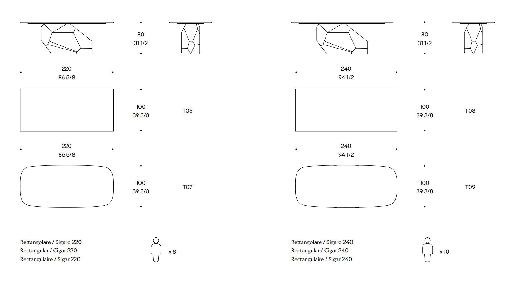 Nekonečné fasety základne stola sú ako svetelné reflektory, ktoré prenikajú do neho, vytvárajúc fascinujúcu optickú hru plného a prázdneho priestoru. Je to ako materiálny vír, ktorý neustále pohybuje a mení, priťahujúc pohľad a podnecujúc predstavivosť.