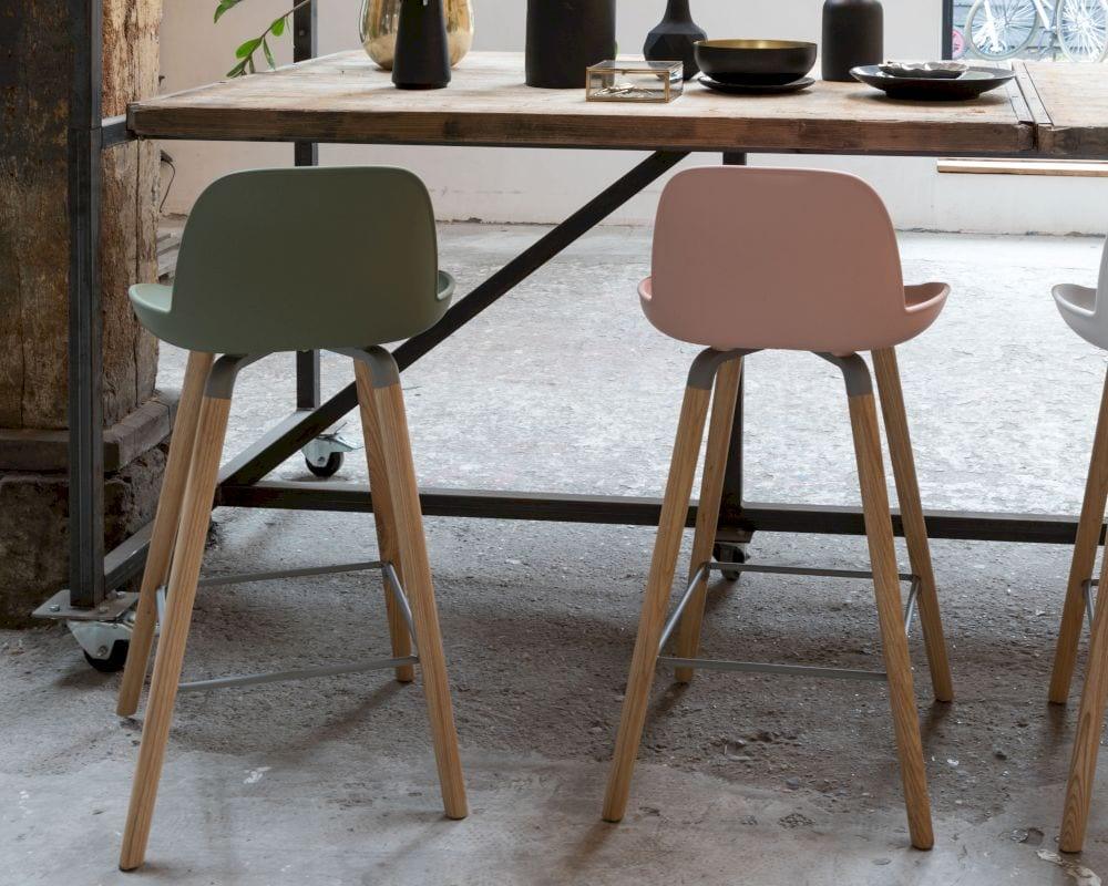 Barový stolička Albert Kuip, navrhnutý amsterdamským štúdiom APE, je úžasná kombinácia moderného štýlu a retro. Oblé sedenie podopierajú drevené, minimalistické nohy z jasanového dreva.
