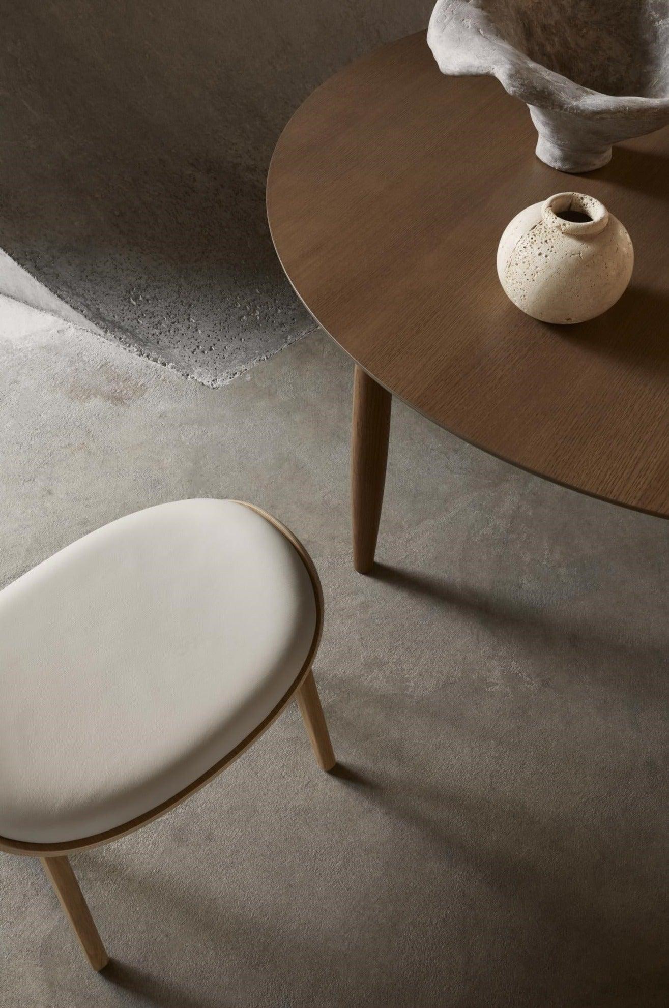 Materiał: drewno dębowe z certyfikatem FSC, tapicerowany wysokiej jakości ekologiczną skórą lub tkaniną boucle