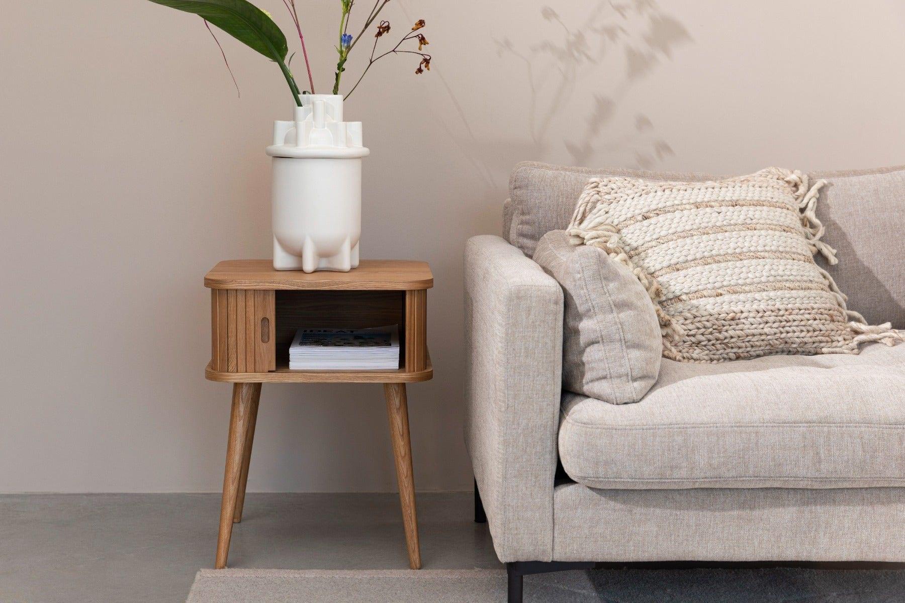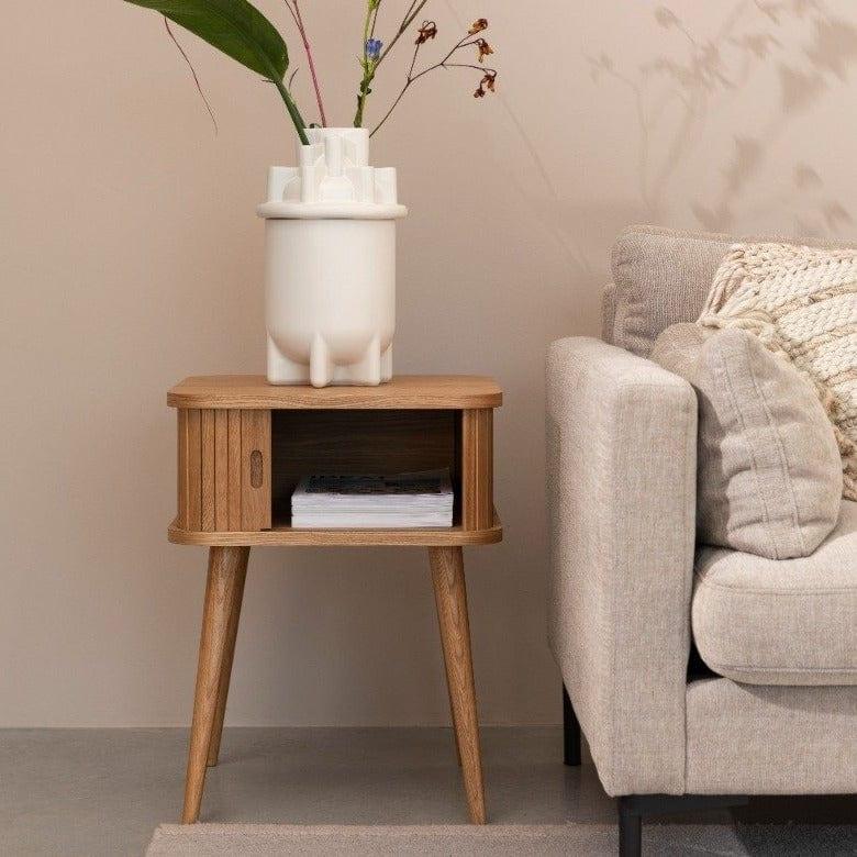 Stolik został wykonany z wytrzymałej płyty MDF pokrytej drewnem jesionu. Nogi wykonano z litego drewna kauczukowego. Barbier pięknie dopełni wnętrze sypialni jako szafka nocna, czy salonu jako poręczny stolik. Dodatkowo stworzy niepowtarzalną aranżację z pozostałymi meblami z tej samej serii.