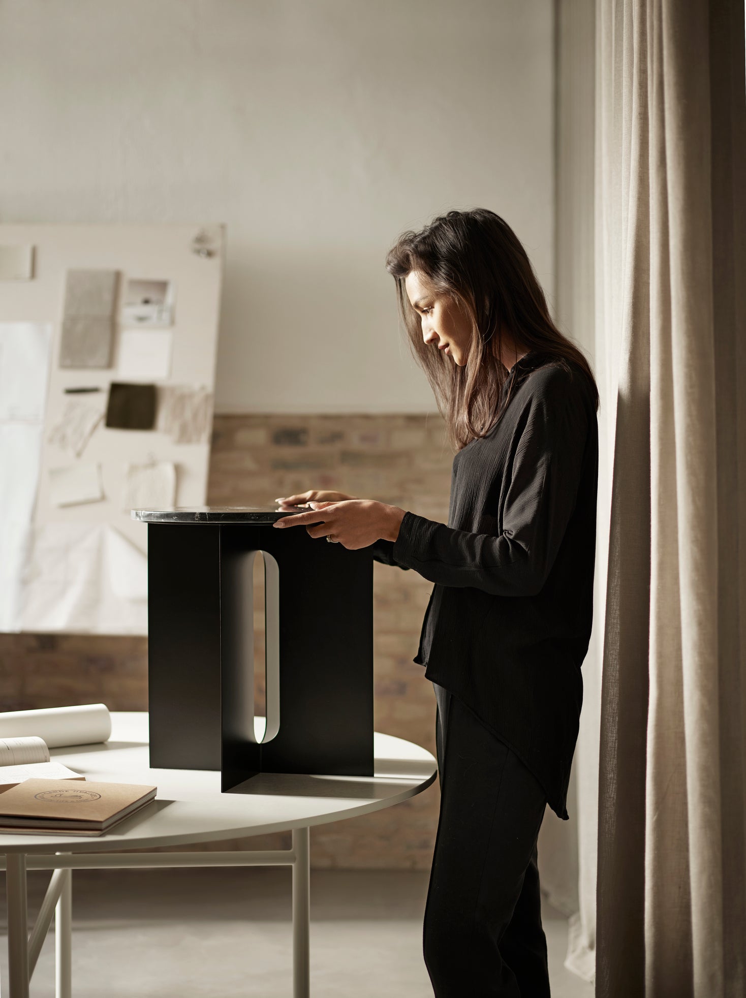 Bočný stolík Androgyne je elegantná funkčná forma, ktorá spája kontrast materiálov a precíznosť spracovania v modernom vydaní. Výrazná základňa z práškovo lakovanej ocele v čiernej farbe dodáva konštrukcii grafický charakter, zatiaľ čo zaoblená mramorová doska Nero Marquina so subtílnym vzorom žíl pridáva celku luxusné dokončenie. Proporcie sú precízne spracované v každom detaile – doska jemne presahuje široké, laserom vyrezávané nohy, čím vytvára dokonale vyváženú formu.