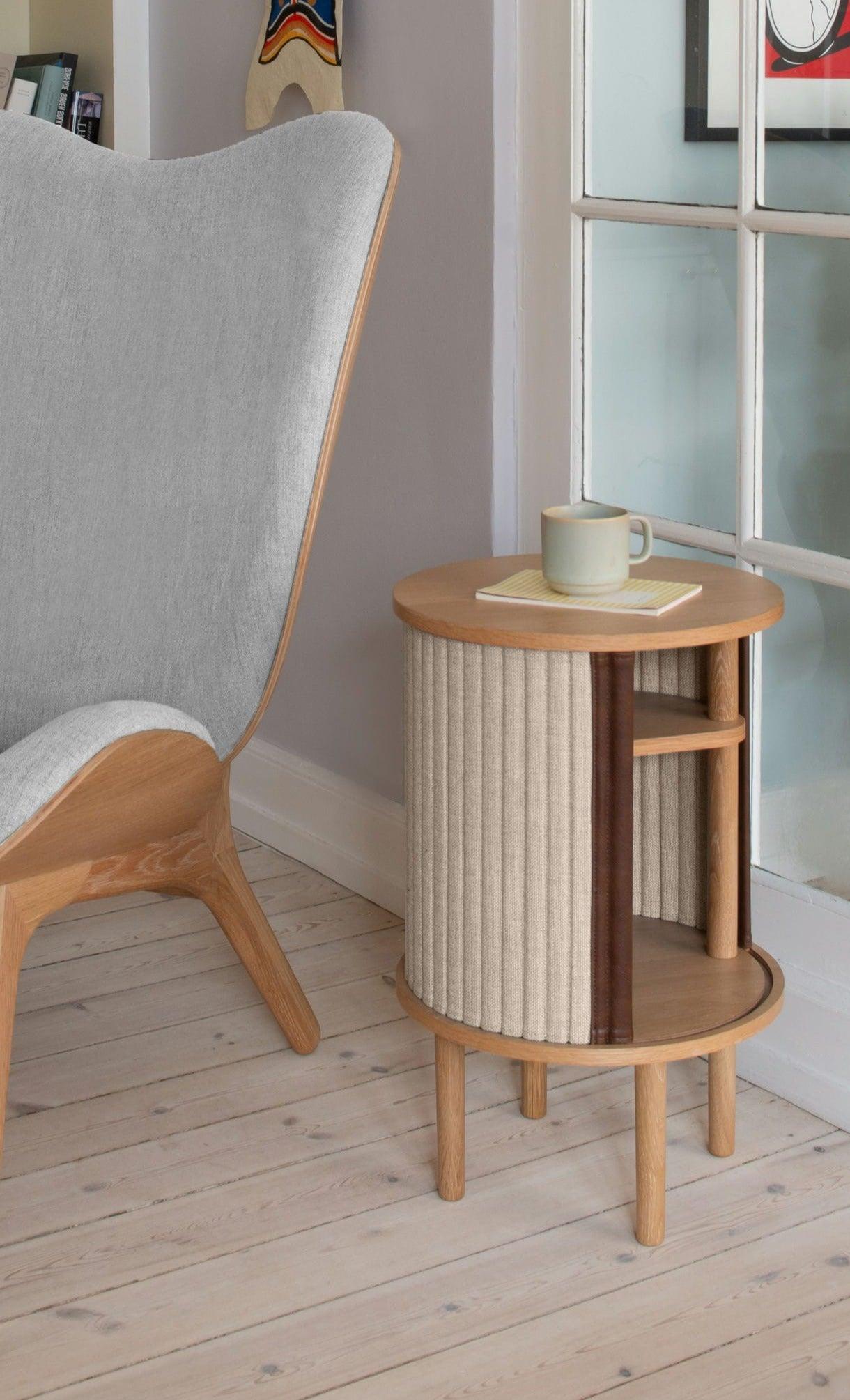 Stolík nielenže ponúka praktické miesto na uskladnenie drobností, ale má aj špeciálne tvarovanú vnútornú poličku s výrezom na vyššie predmety, ako sú knihy či časopisy.