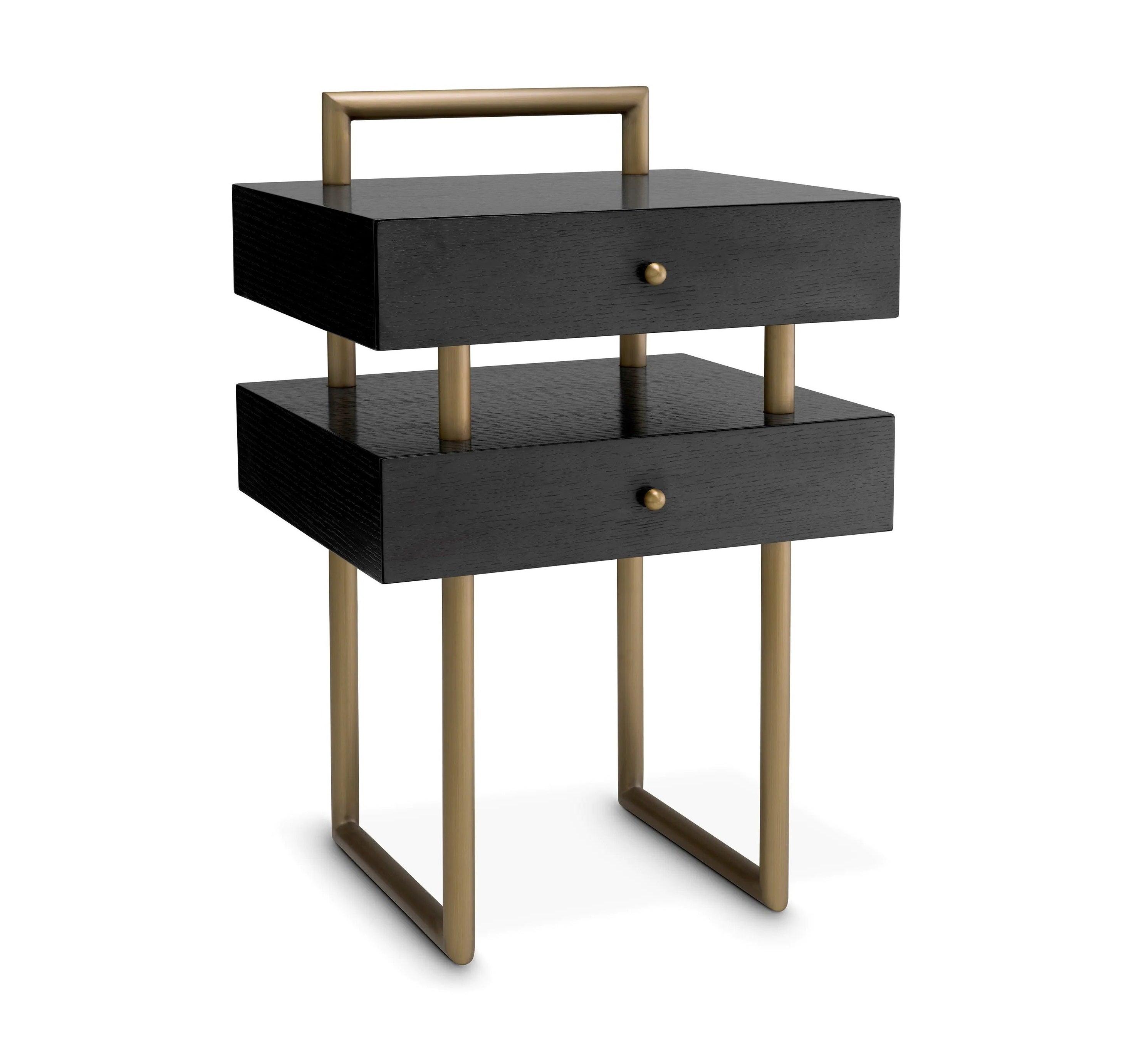 Rám vyrobený z brúseného mosadze nielenže zabezpečuje trvácnosť a stabilitu nábytku, ale tiež mu dodáva lesk a moderný vzhľad. Čierny dub, z ktorého je vyrobená doska a zásuvka, nie je len odolným materiálom, ale aj vyžaruje hĺbku a triedu. Kontrast oceľového rámu a tmavého dreva vytvára harmonické a súdržné spojenie, ktoré, bez ohľadu na prostredie, v ktorom sa nachádza, bude vyžarovať moderný luxus.