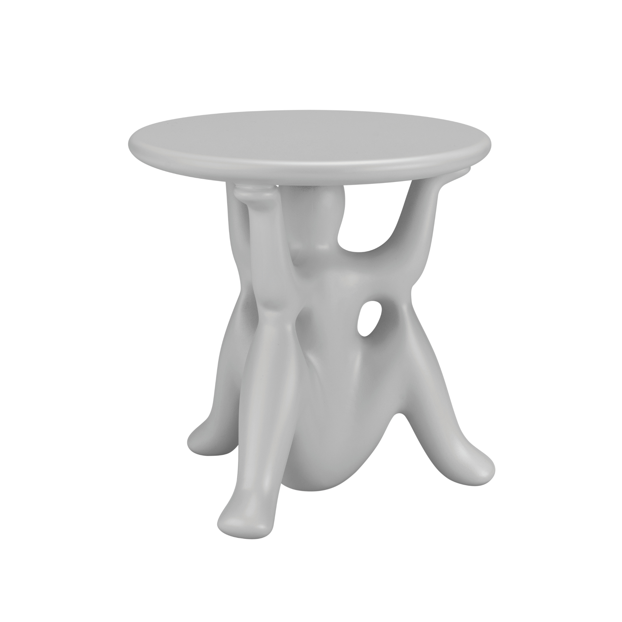 Stolík bol vyrobený výhradne z odolného polyetylénu formovaného v jednom kuse, čo zaručuje trvácnosť a jednoduchú údržbu. Vďaka svojej sochárskej forme a priemeru 46,5 cm, Hhelpyourself skvele poslúži ako pomocný stolík pri pohovke, dekoratívny prvok v obývačke alebo netradičný akcent v komerčných priestoroch.