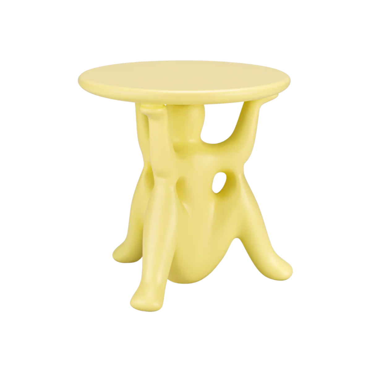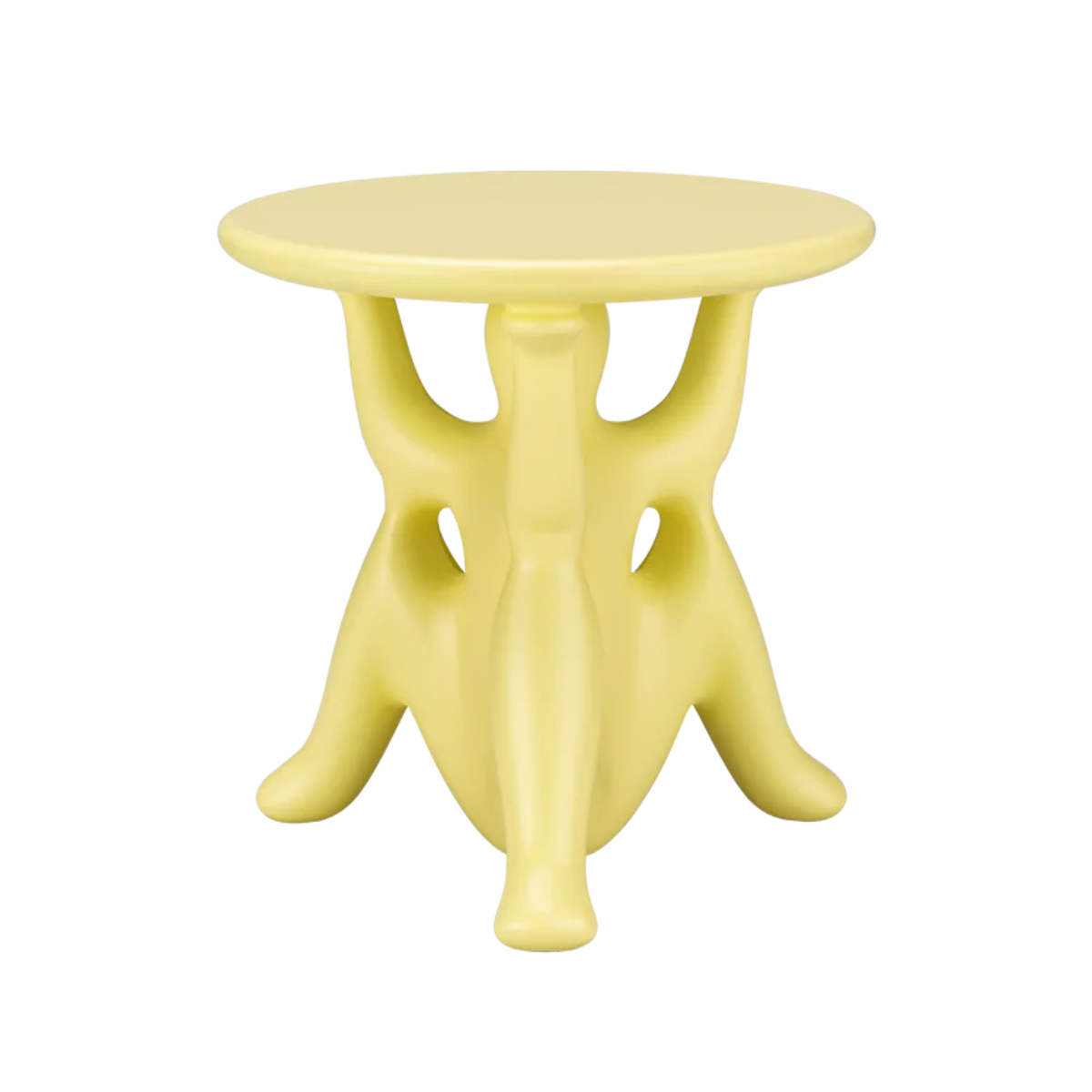 Stolík bol vyrobený výhradne z odolného polyetylénu formovaného v jednom kuse, čo zaručuje trvácnosť a jednoduchú údržbu. Vďaka svojej sochárskej forme a priemeru 46,5 cm, Hhelpyourself skvele poslúži ako pomocný stolík pri pohovke, dekoratívny prvok v obývačke alebo netradičný akcent v komerčných priestoroch.