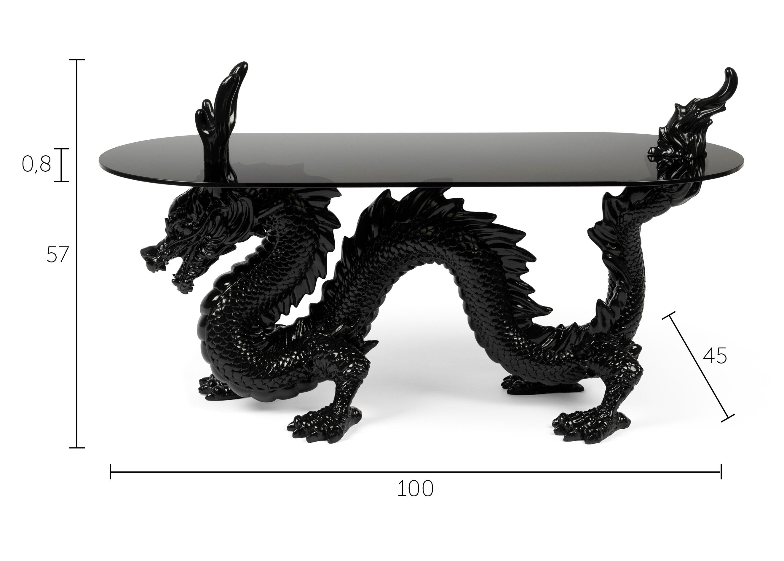 Stolik charakteryzuje się przydymionym czarnym szkłem, które harmonijnie łączy się ze złotymi, galwanizowanymi detalami. Podstawa stolika, przedstawiająca czarnego smoka, jest wykonana z żywicy i ma błyszczące wykończenie, dodając całości wyjątkowego charakteru.