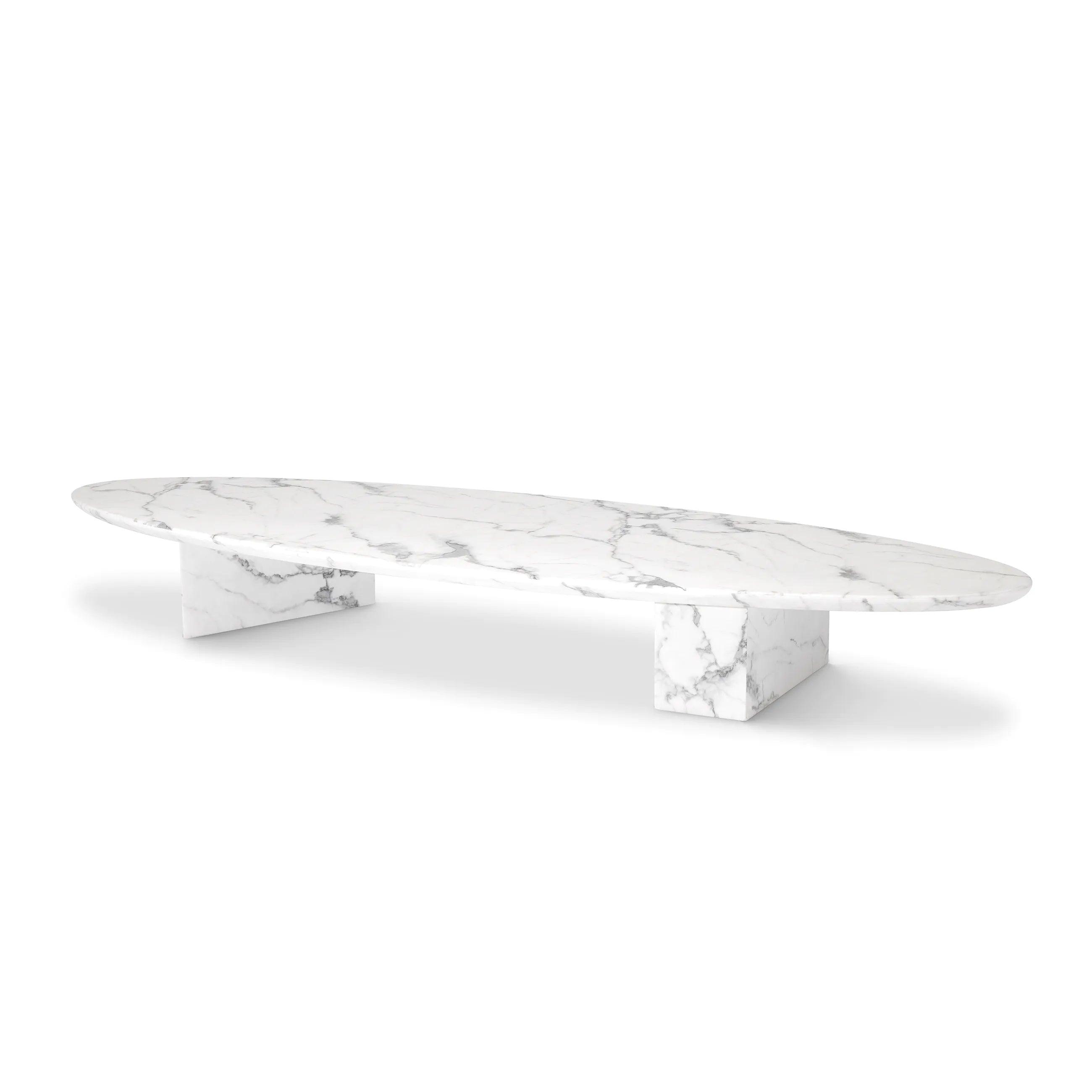 Centrálnym prvkom stolíka je oválny vrch, ktorý mu dodáva jemnosť a harmóniu. Biely umelý mramor, na ktorom spočíva vrch, mu dáva luxusný vzhľad, pripomínajúci pravý kameň, ale zároveň vnáša do interiéru svoj vlastný jedinečný charakter. Vrch spočíva na dvoch pevných trojuholníkových blokoch, ktoré predstavujú nielen stabilnú oporu, ale aj dekoratívne prvky. Ich geometrický tvar kontrastuje s plynulým oválom vrchu, čím vytvára zaujímavú hru tvarov a proporcií.
