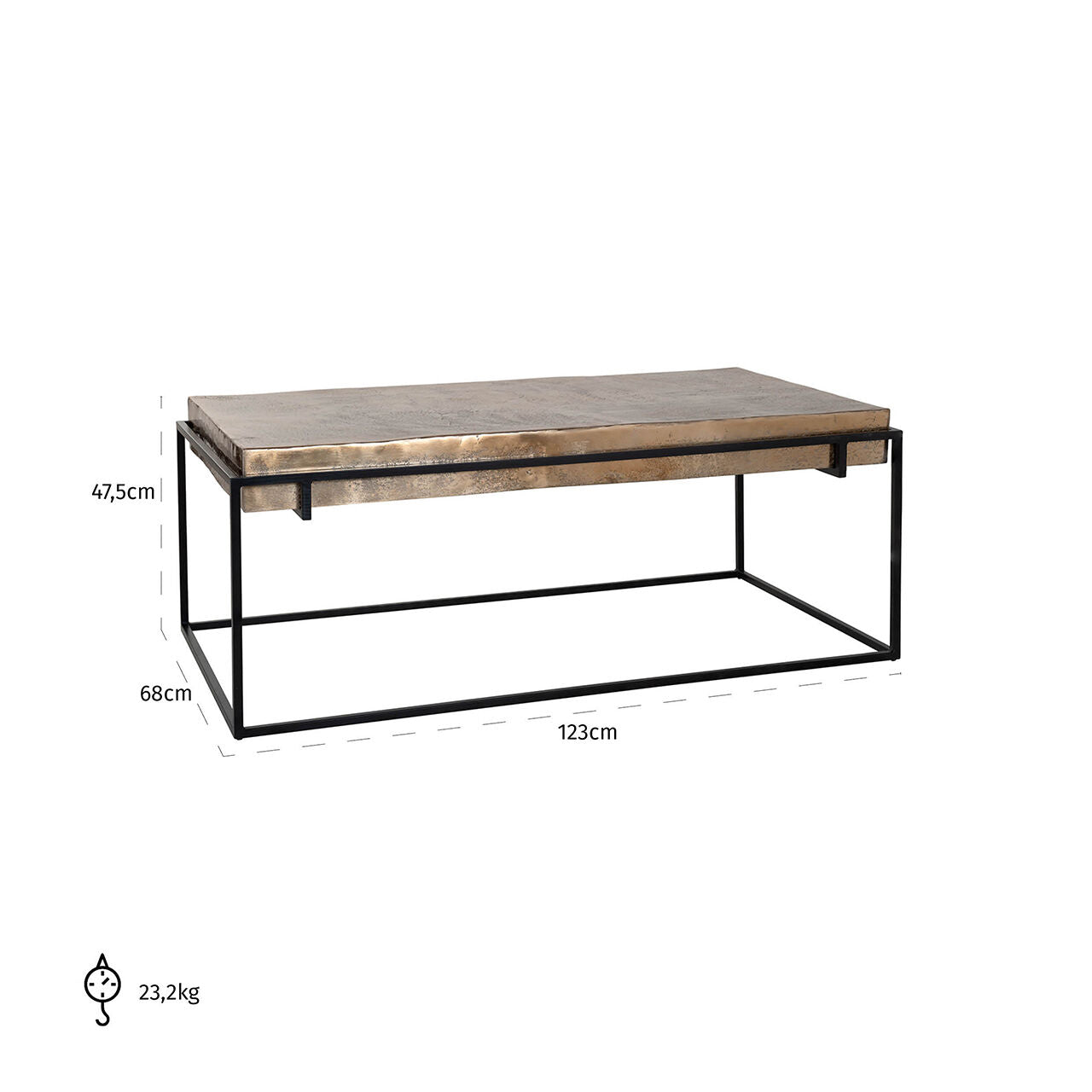 Calloway je výnimočný konferenčný stolík, ktorý sa vyznačuje nielen pevnosťou, ale aj elegantným vzhľadom. Je vyrobený z jedinečnej hliníkovej dosky v krásnom odtieni šampanského zlata, ktorý mu dodáva luxusný lesk a jedinečný vzhľad. Táto doska harmonicky ladí s rámom vyrobeným z čierneho kovu, čím vytvára kontrastnú a pevnú štruktúru.