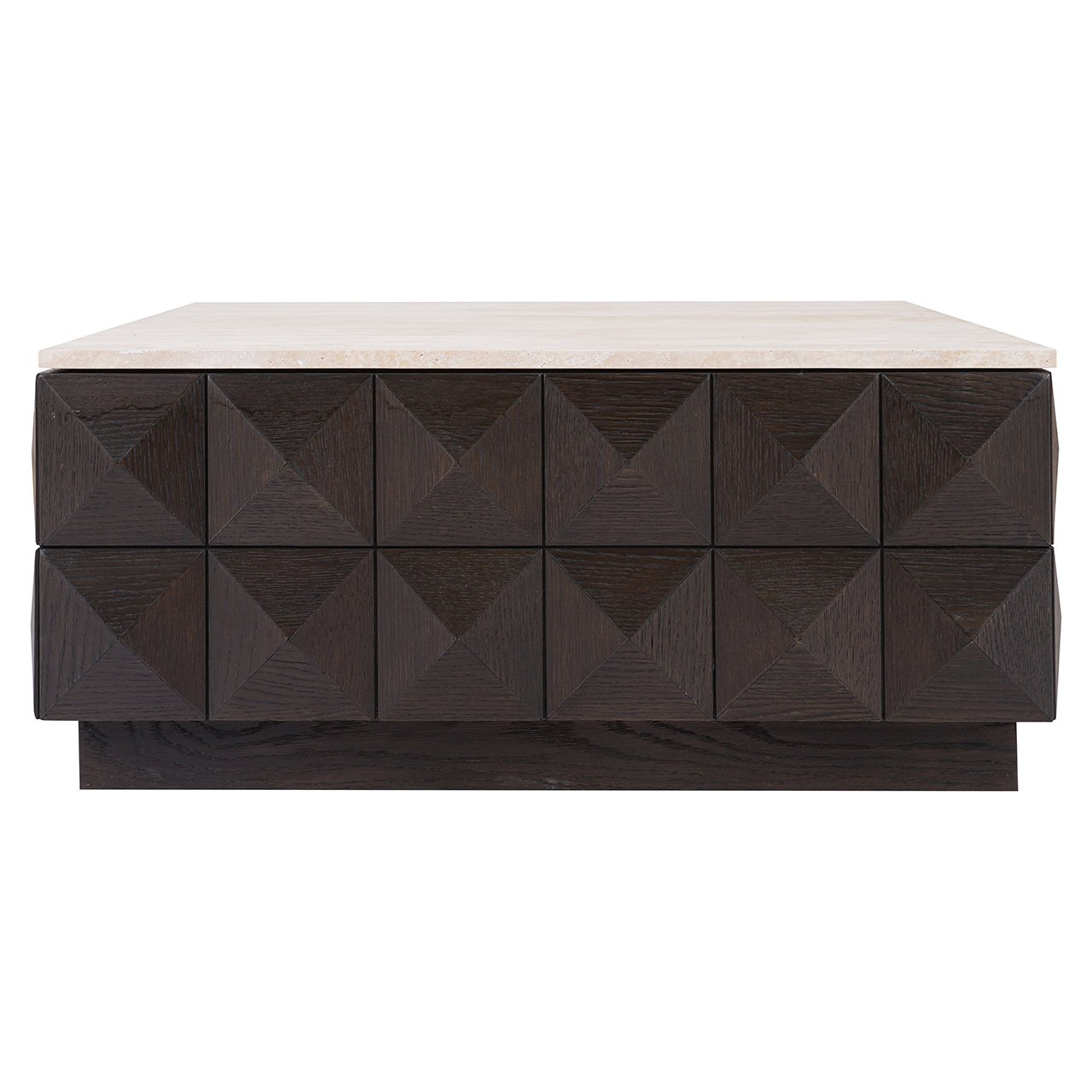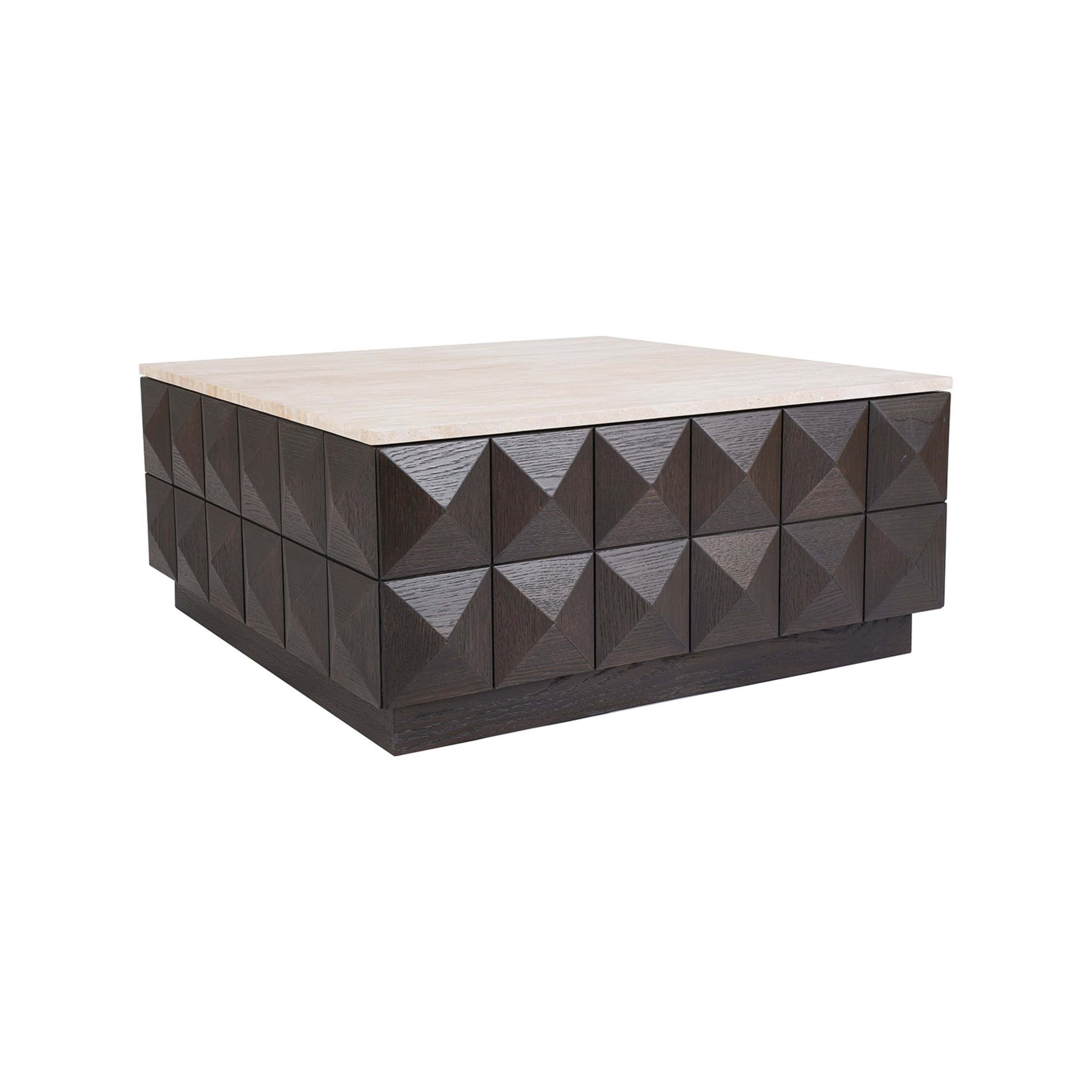 Kávový stolík Claremont je jedinečný kus nábytku, ktorý spája prírodnú krásu dreva a eleganciu kameňa. Geometrické predné strany z dubového dyhy vytvárajú pôsobivú, trojrozmernú štruktúru, ktorá dodáva charakter každej aranžmácii. Svetlá doska z kameňa kontrastuje s tmavým povrchom dreva, čím celku dodáva moderný, a zároveň nadčasový štýl. Je to kávový stolík, ktorý sa stane centrálnym bodom vo vašej obývačke, prinášajúc harmóniu a rafinovaný dizajn.