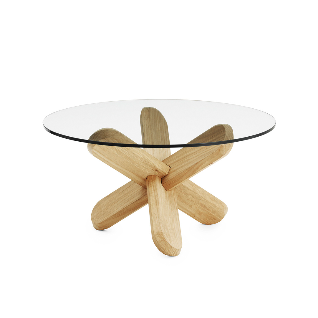Kávový stolík Ding je kombináciou minimalistického dizajnu a funkčnosti, inšpirovanou tradičnými trojrozmernými hlavolamami. Tri dubové nohy sú montované bez použitia náradia a skrutiek, čím vytvárajú sochársku základňu pre sklenenú dosku. Fazetové hrany zabezpečujú stabilitu a okrúhla sklenená doska bezpečne spočíva na konštrukcii.