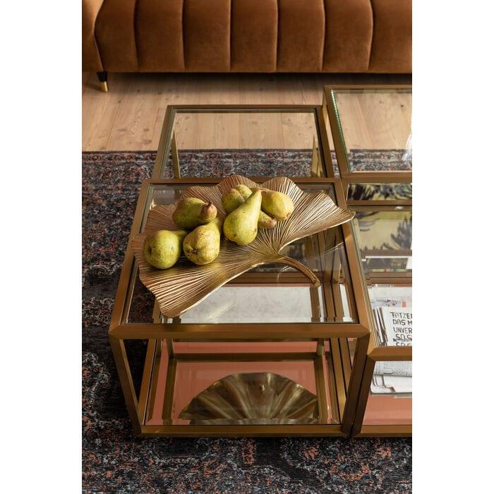 Elegantný konferenčný stolík Glam vytvára neobmedzené možnosti! Stolik sa skladá zo štyroch sklenených blokov, ktoré spolu tvoria konferenčný stolík v glamour štýle — ale môžu sa tiež umiestniť samostatne alebo v pároch. Harmonické spojenie sklenenej plochy a zlata osloví milovníkov luxusného nábytku.