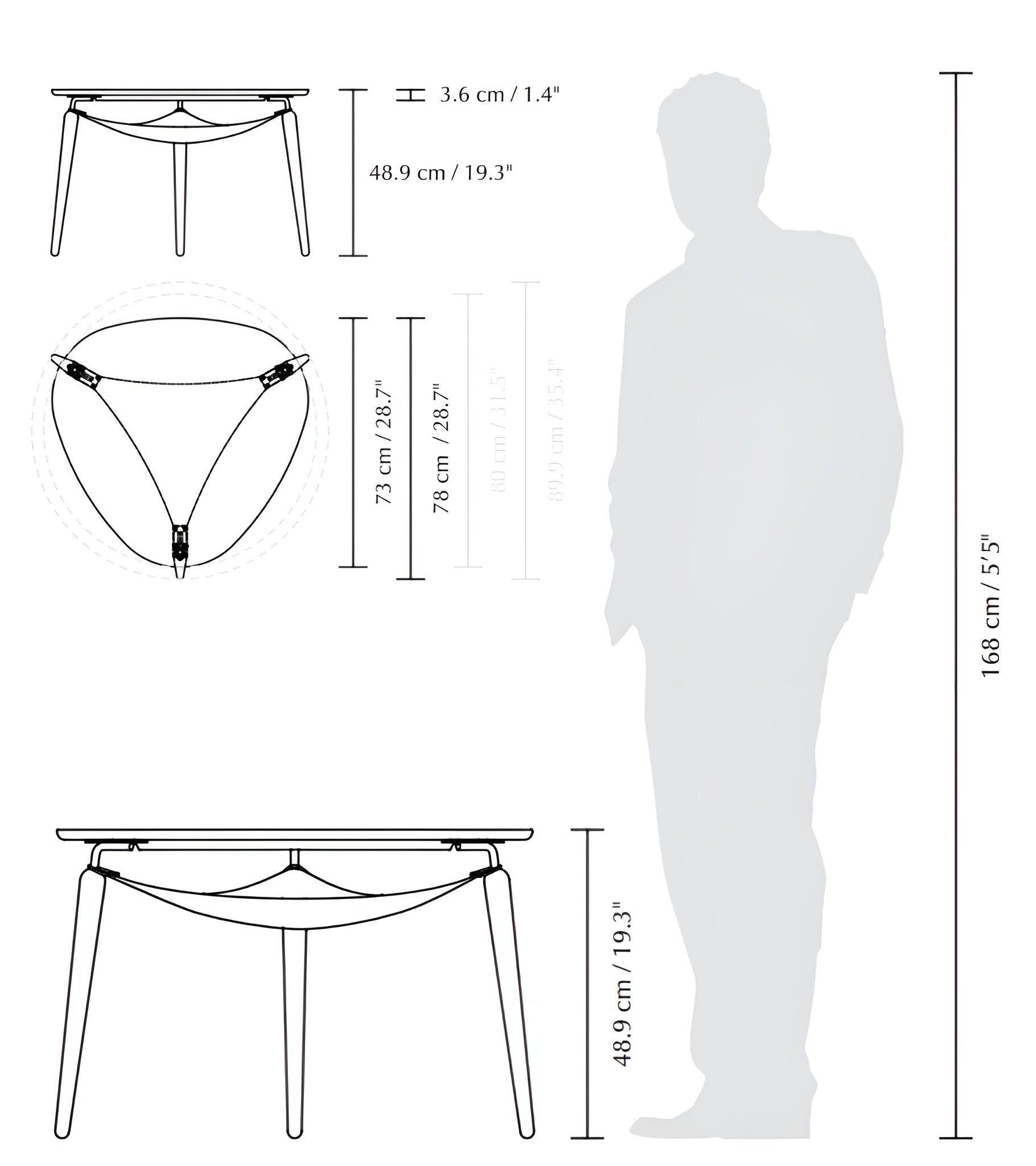 Pod doskou stolíka visí výnimočná, obojstranná taška pripomínajúca hojdaciu sieť, ideálna na uskladnenie drobných predmetov. Z jednej strany je vyrobená z textílie, z druhej z imitácie kože – tašku je možné ľahko otočiť, čím sa zmení vzhľad stolíka a prispôsobí sa aktuálnemu zariadeniu interiéru.