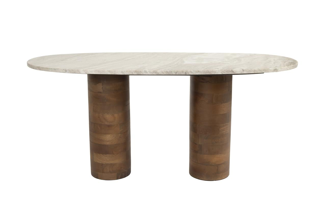 Tento elegantný konferenčný stolík pritiahne pozornosť nielen svojím originálnym tvarom, ale aj luxusným spojením materiálov. Oválny vrch z masívneho mramoru je osadený na dvoch masívnych, cylindrických nohách z mangového dreva, čím vytvára pôsobivý kontrast textúr a farieb. Je to nábytok, ktorý sa ľahko stane centrálnym bodom interiéru a zdôrazní charakter moderných, elegantných aranžmánov.