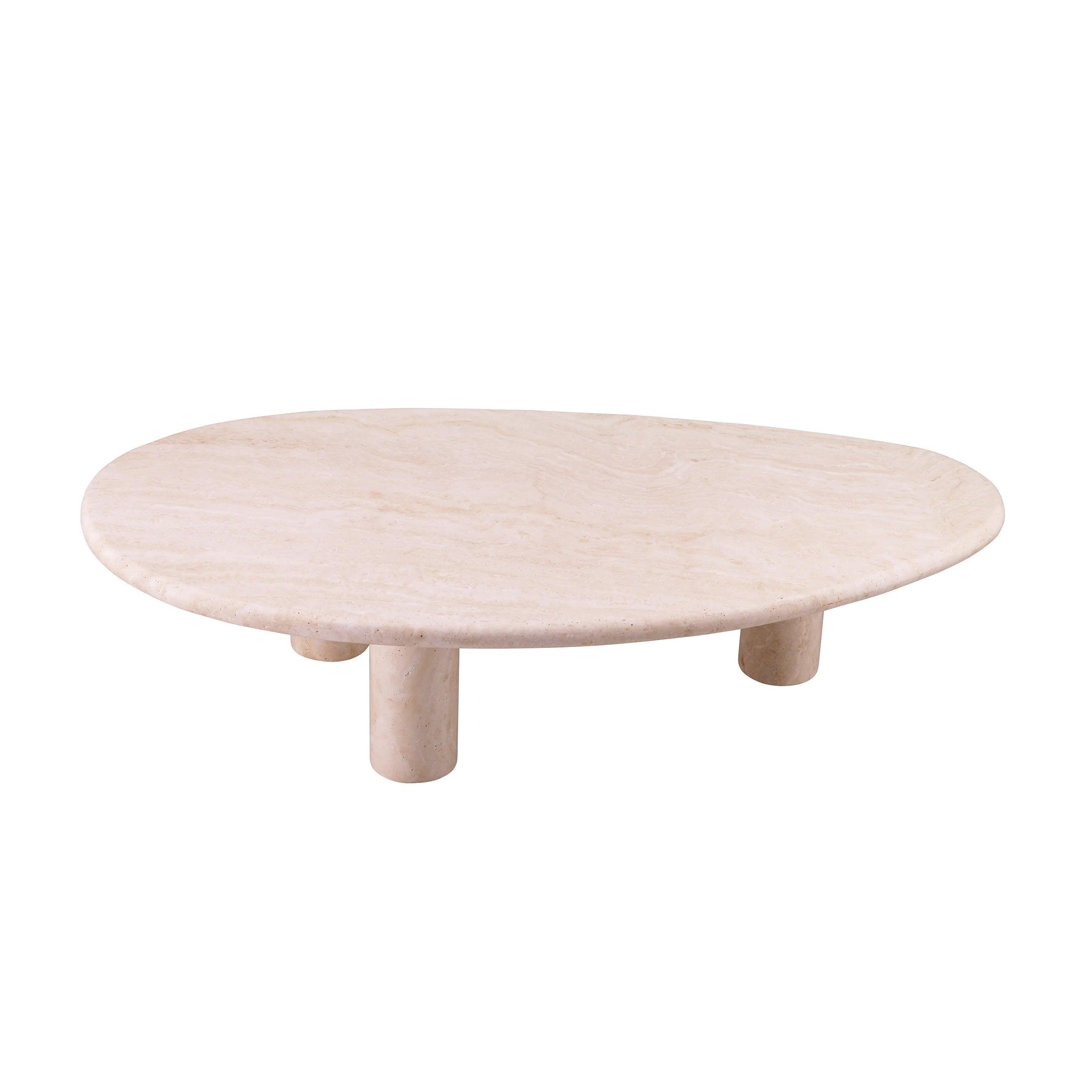 To, čo okamžite upúta pozornosť, je jedinečný dizajn travertínového stolíka. Jeho voľný tvar je zároveň jednoduchý a zaujímavý, predstavujúc osviežujúce odklonenie od konvenčných foriem. Výrazné štyri nohy stolíka nie sú umiestnené tak, ako to poznáme z väčšiny kávových stolíkov. Namiesto toho, ich pozícia a uhol sklonu dodávajú nábytku dynamiku a pocit ľahkosti, napriek pevnému materiálu, z ktorého je vyrobený.