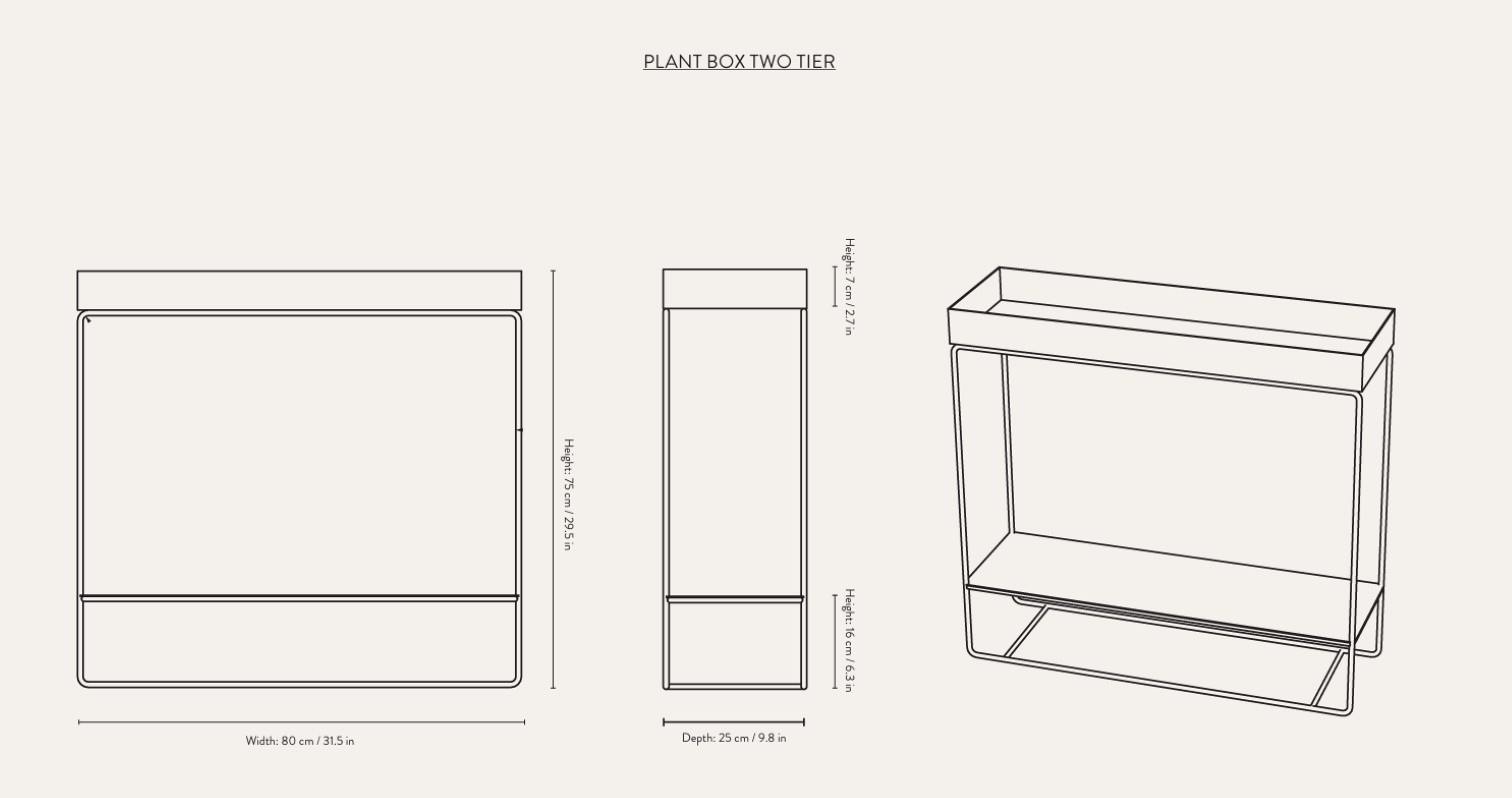 Inšpirovaná populárnym modelom Plant Box, konzola s dvoma úrovňami v béžovej farbe prináša novú kvalitu do priestoru. S zachovaním tých istých elegantných línií, ktoré sú rozpoznateľné v celej sérii, nová konfigurácia ponúka priestrannú hornú nádobu a dolnú poličku, ktoré sú ideálne na uskladnenie a vystavenie dekoratívnych doplnkov a praktických predmetov každodennej potreby, ako sú šálky, taniere či fľaše. Štíhla silueta zabezpečuje, že stolik konzolový sa perfektne hodí do väčšiny priestorov, pričom predstavuje skvelé riešenie pre izbové rastliny doma, ako aj na balkónovú plochu na uskladnenie.