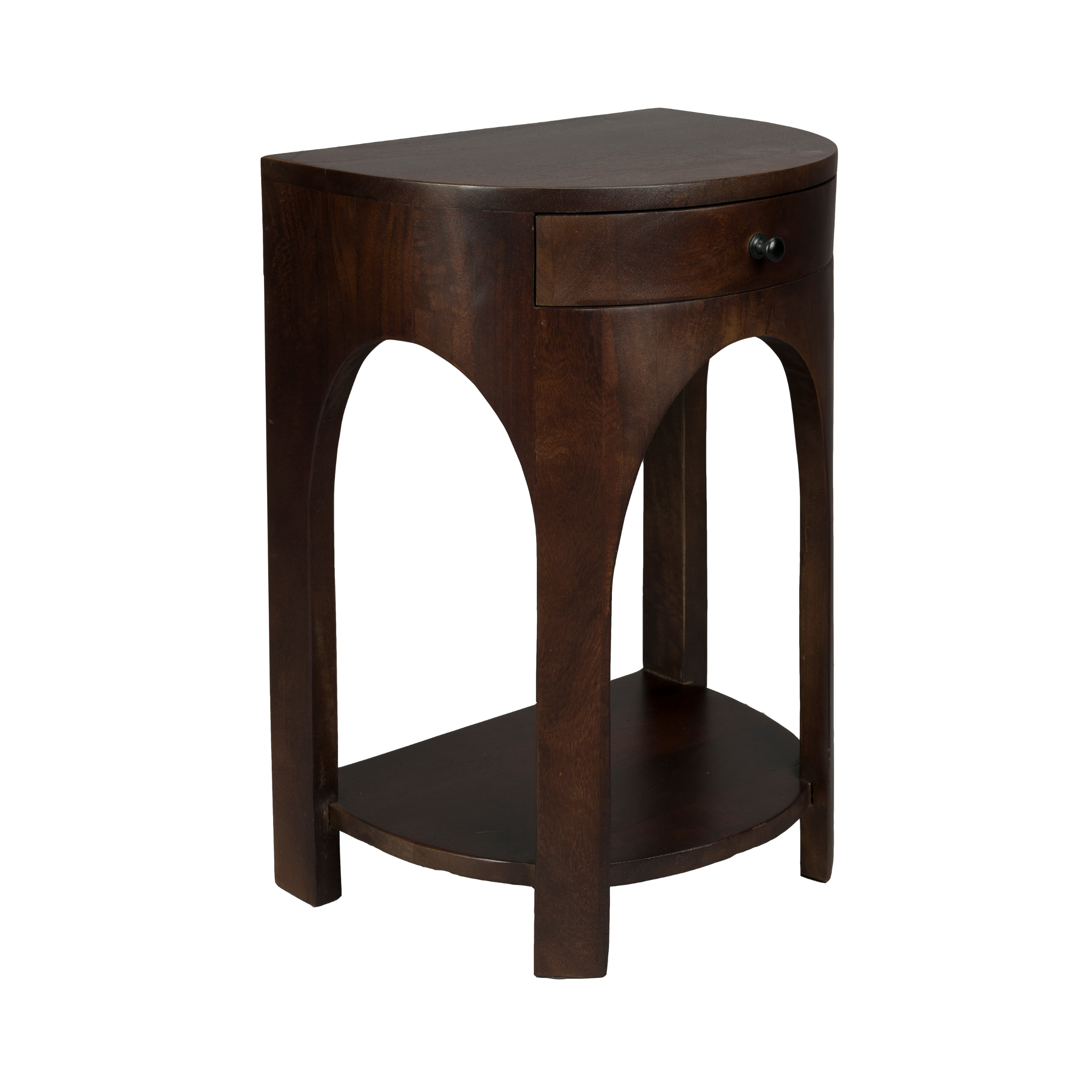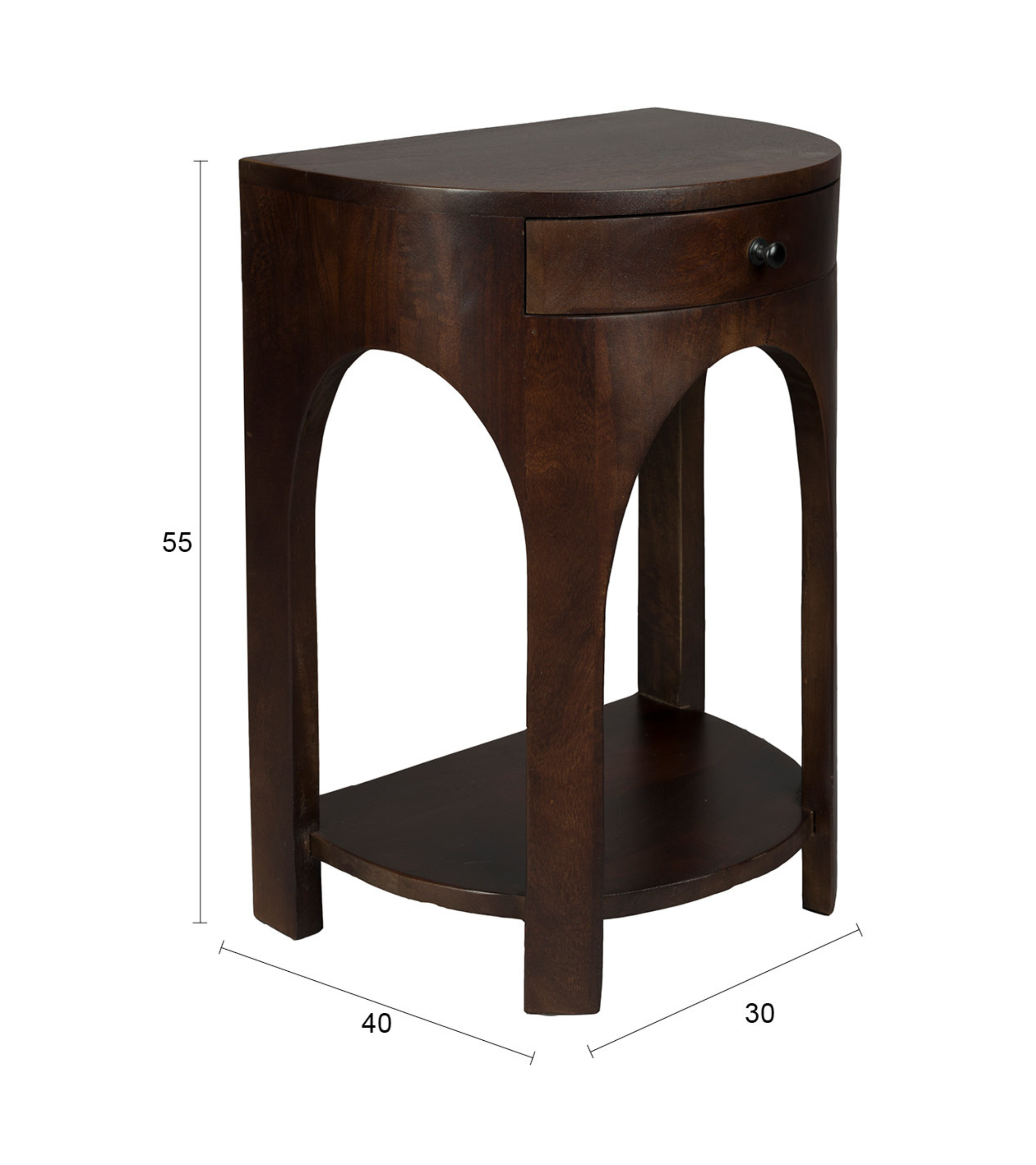 Stolík Belvedere je praktický a štýlový doplnok, ktorý sa skvele hodí do obývačky, spálne alebo útulného kútika na čítanie. Vďaka plochému chrbtu ho môžete postaviť priamo pri stene, čo z neho robí ideálny nábytok aj do menších priestorov. Zaoblené tvary, polkruhové výrezy a hlboký orechový odtieň mangového dreva mu dodávajú eleganciu a útulný, retro charakter z 50. rokov.