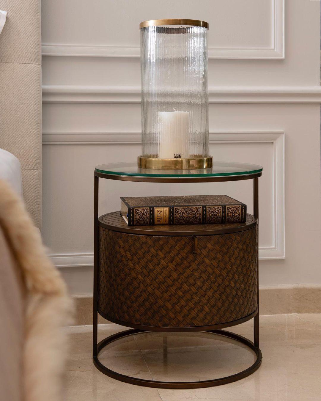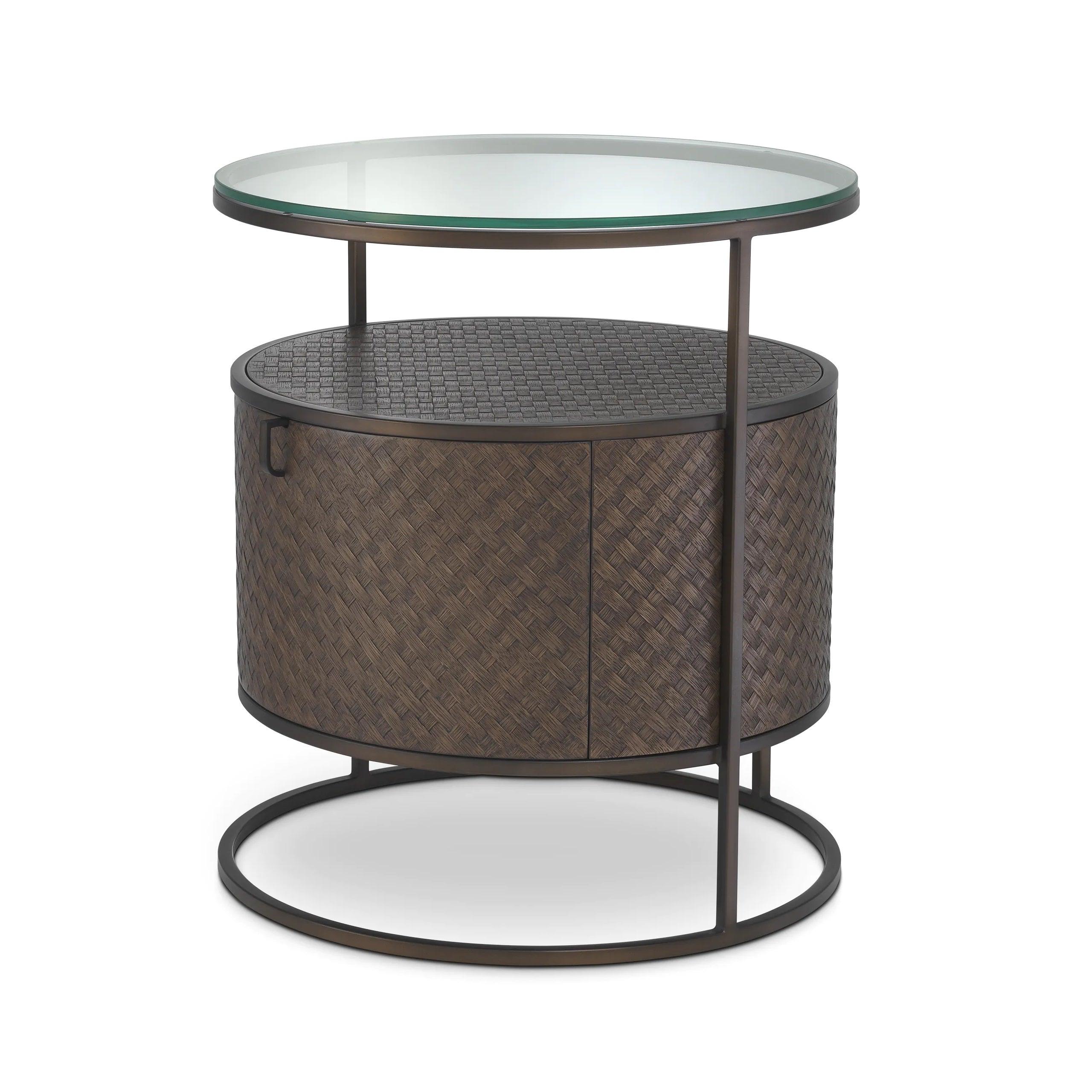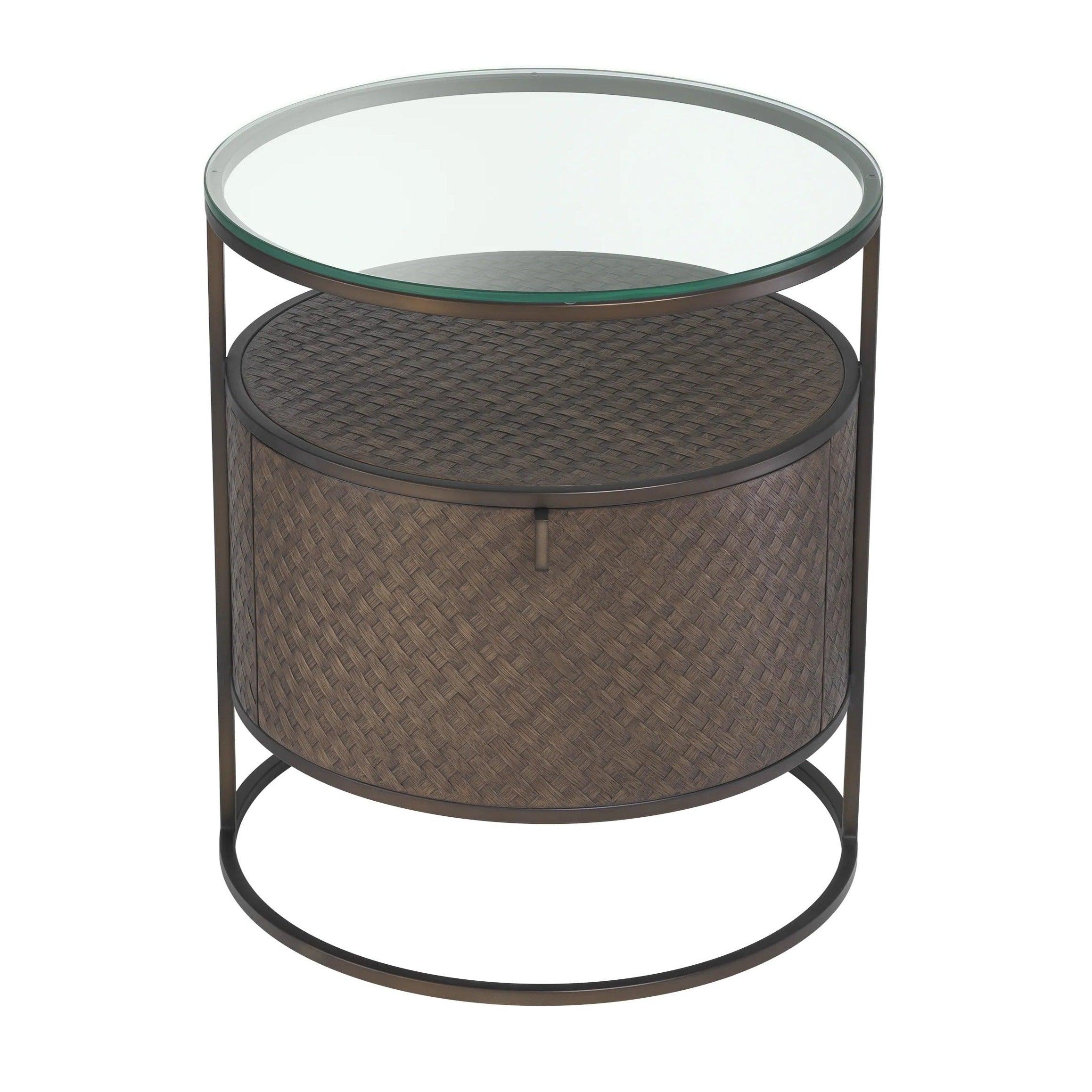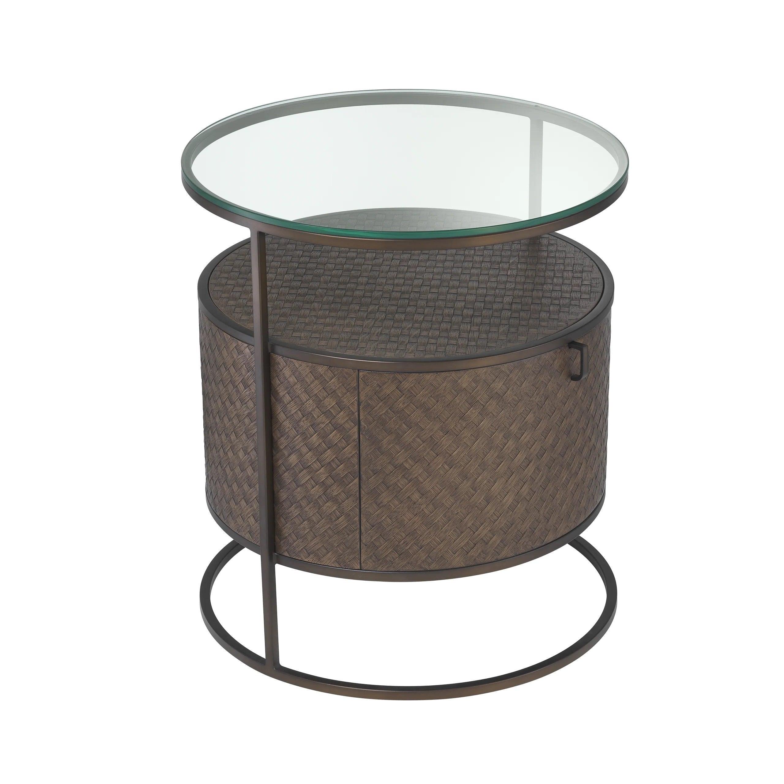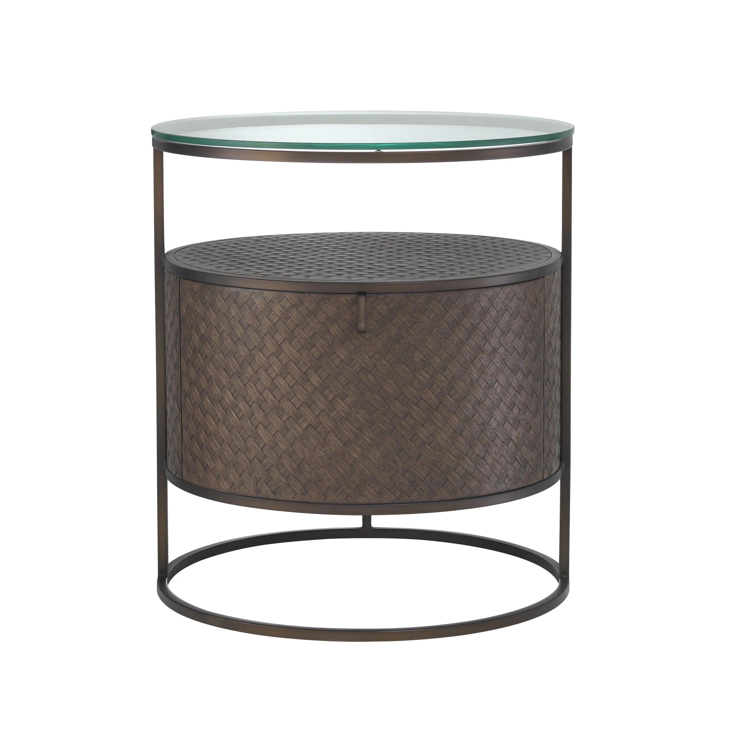 Jeho elegantný rám, vyrobený z nehrdzavejúcej ocele, kontrastuje s priehľadnou sklenenou doskou, čím vytvára harmonickú a zároveň zaujímavú kompozíciu. Centrálny prvok v tvare bubna, potiahnutý tkaným dubovým dyhou, pridáva hĺbku a charakter celému projektu. Vo vnútri tohto bubna sa skrýva praktická zásuvka so subtílnym úchytom z nehrdzavejúcej ocele, ktorá je ideálna na uskladnenie drobností.