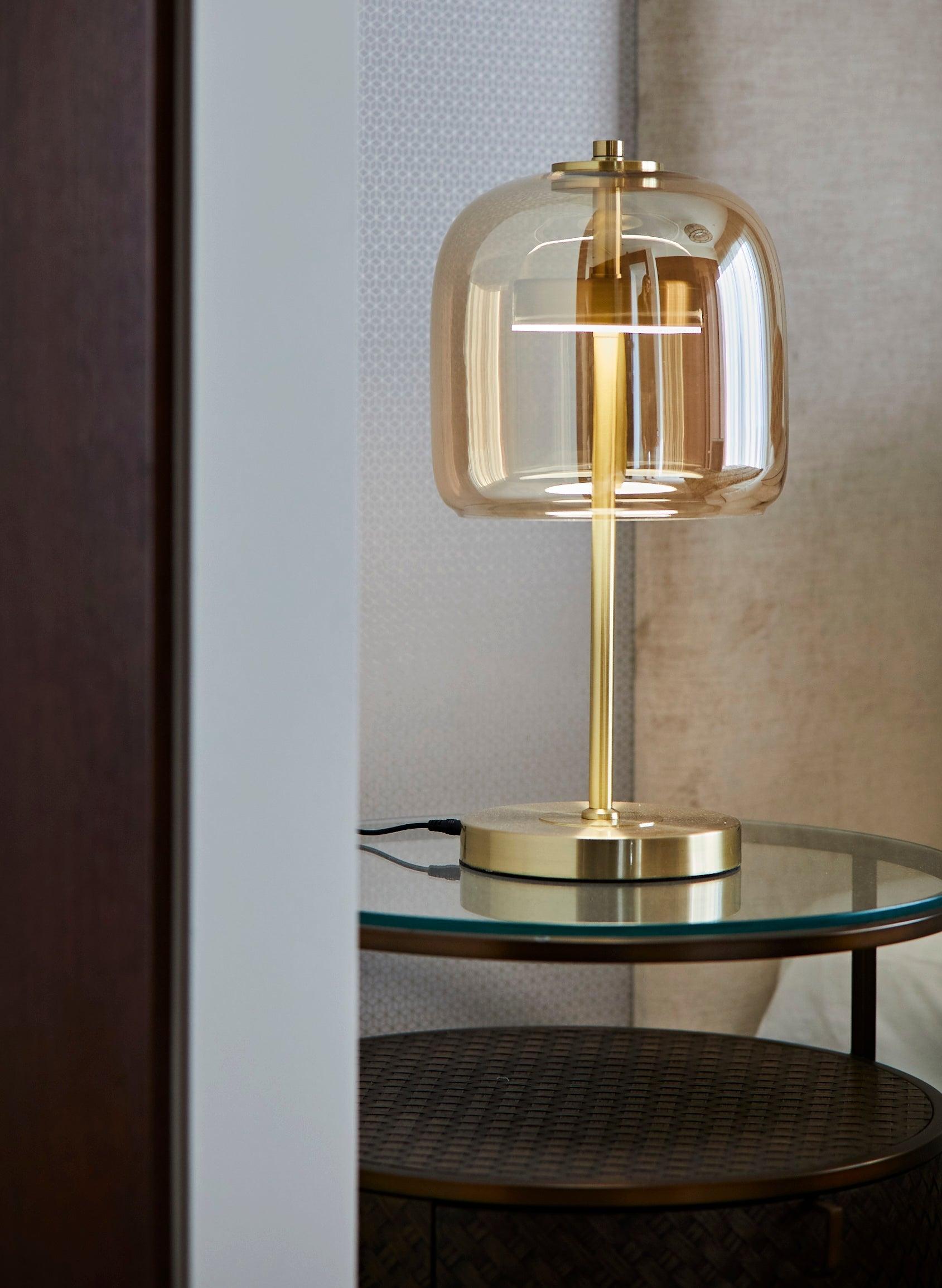Materiał: Tkany fornir dębowy prany, wykończenie ze szczotkowanego mosiądzu, jasne szkło