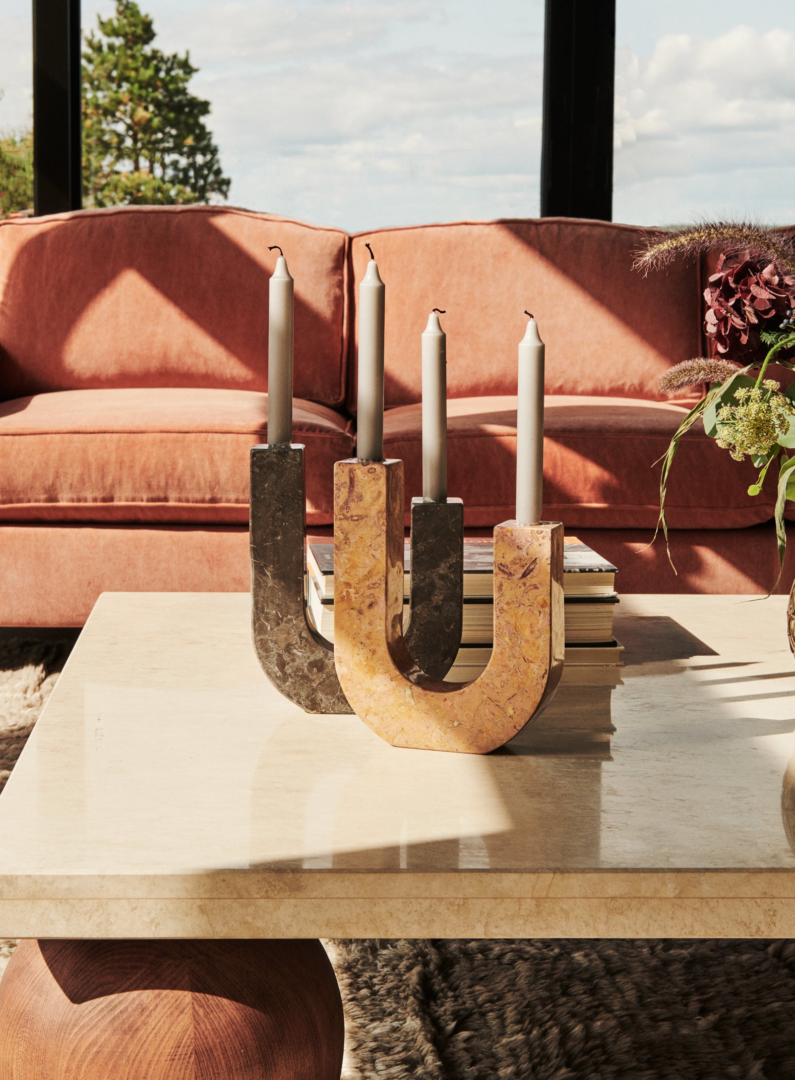 Svietnik Arco je sochárska forma vyrobená z masívneho mramoru, ktorého prirodzené žilkovanie a odtiene robia každý kus jedinečným. Jeho výnimočný tvar je inšpirovaný architektúrou mesta Palma de Mallorca – odkazuje na monumentálne oblúky, ktoré sa nachádzajú v historických budovách južnej Európy.