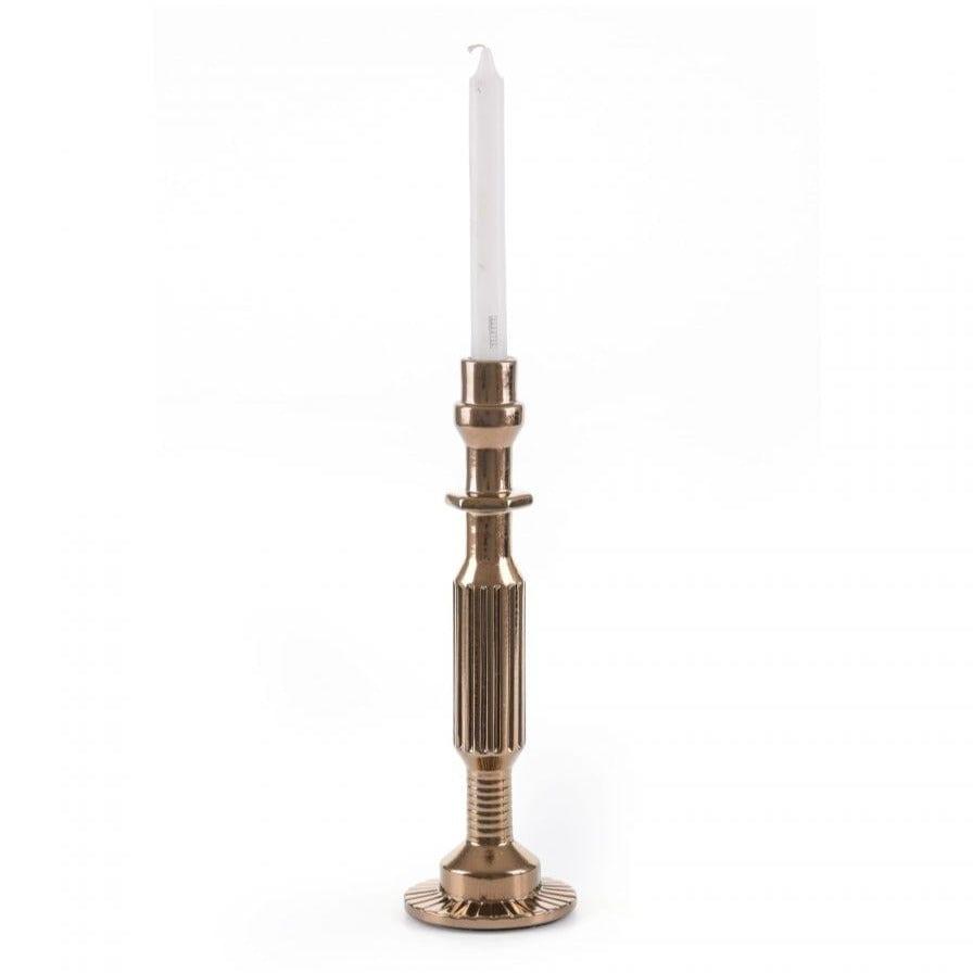 Świecznik wykonano z ceramiki w kolorze antycznego brązu.
