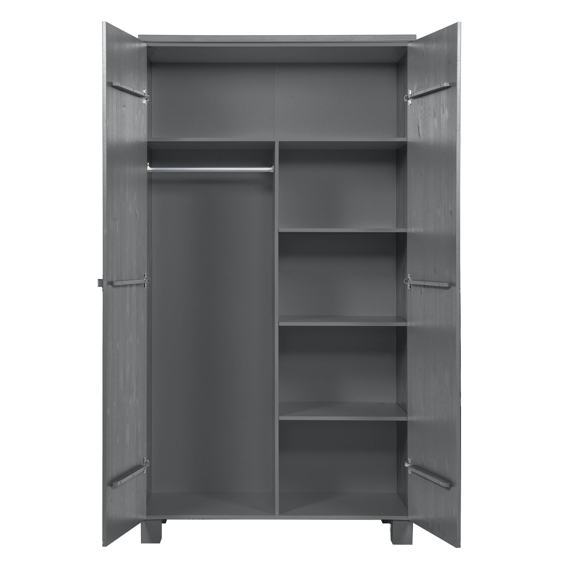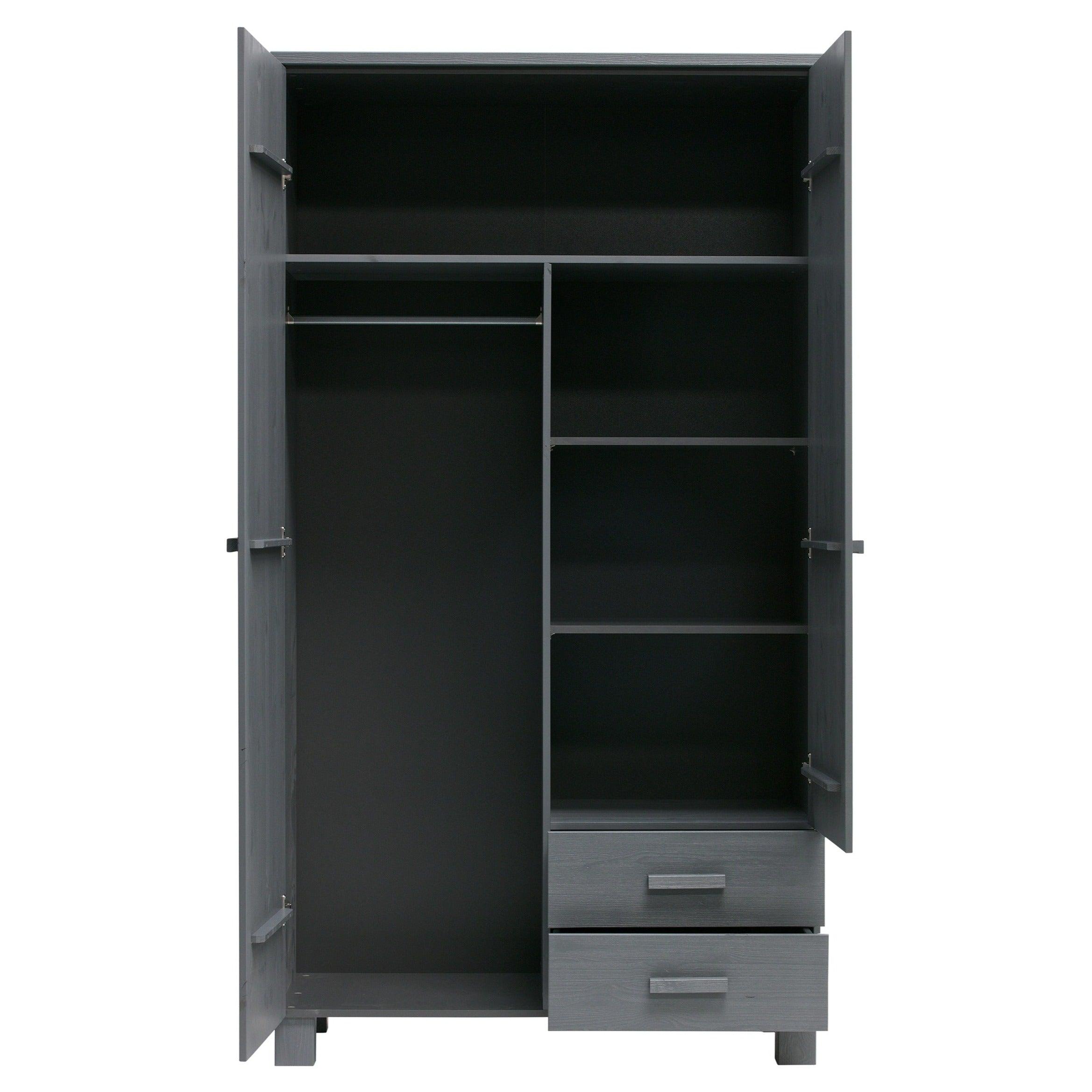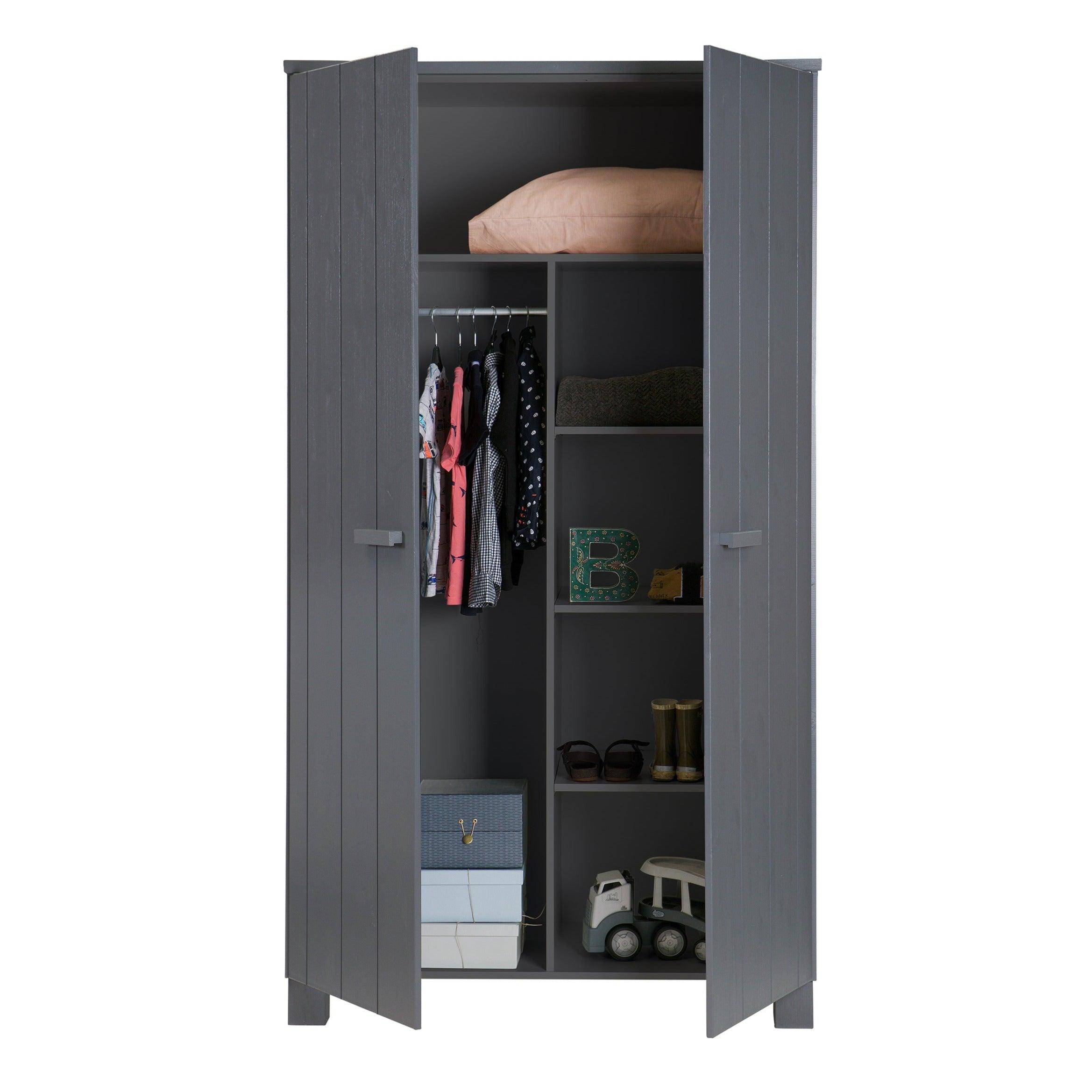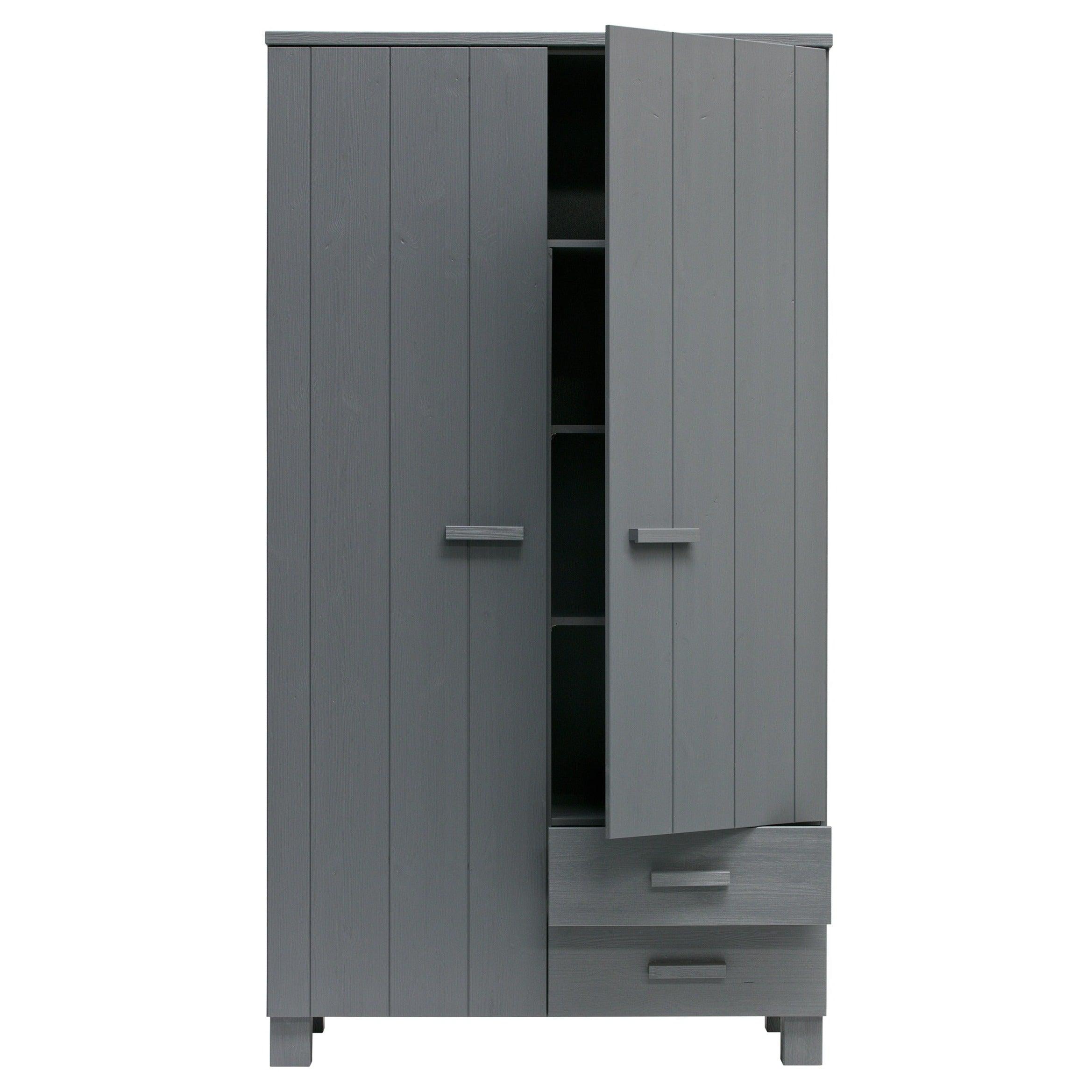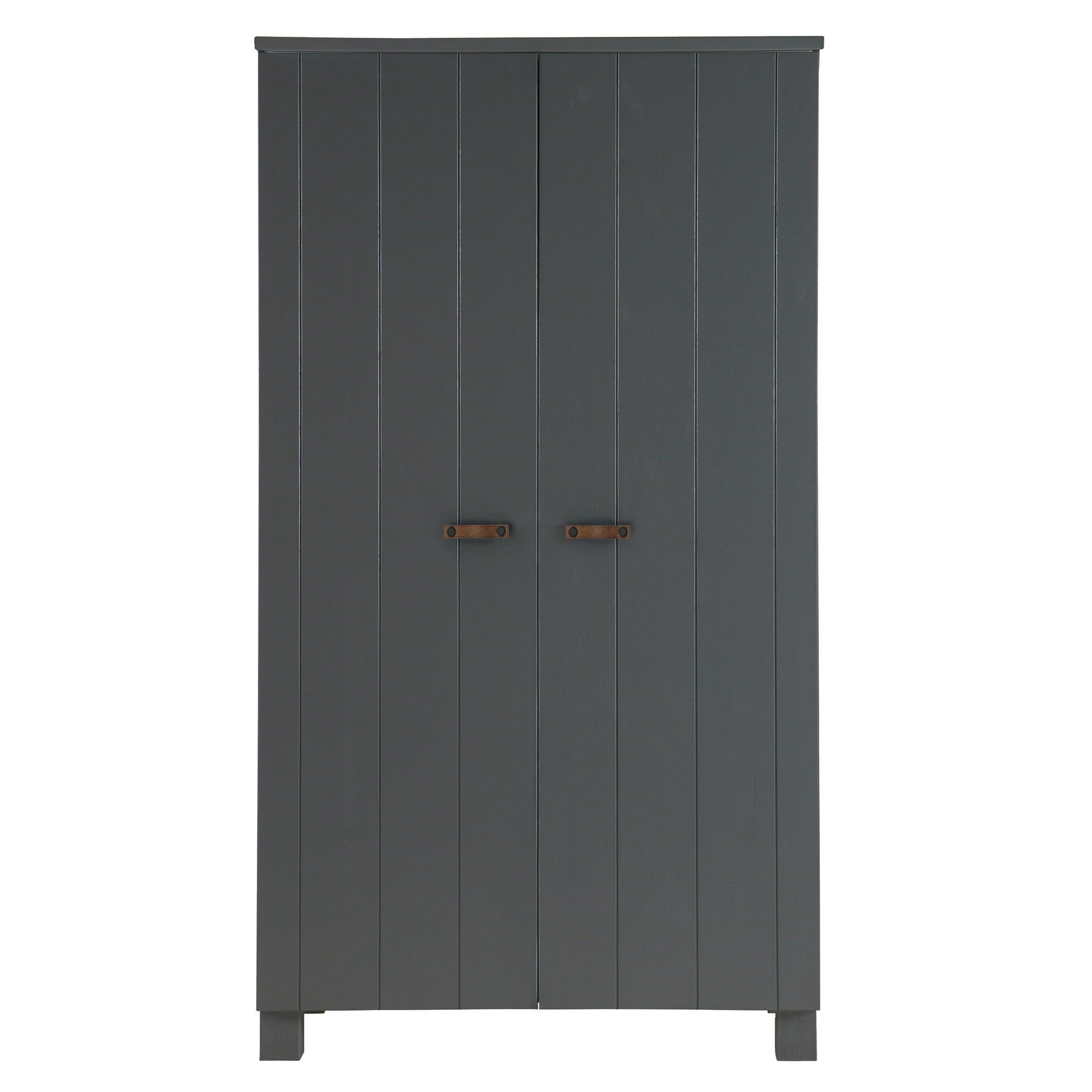 Grafitová skriňa Dennis je vyrobená z borovicového dreva, ktoré jej zabezpečuje dlhú životnosť a odolnosť. Dve dvere sa ľahko otvárajú, odhaľujúc úložný priestor, ktorý je dostatočne priestranný na to, aby sa doň zmestilo všetko, čo potrebujete - od oblečenia po posteľnú bielizeň či uteráky. Okrem toho môže byť skriňa vybavená dvoma praktickými zásuvkami, ktoré umožňujú ešte lepšiu organizáciu a uskladnenie drobných predmetov.