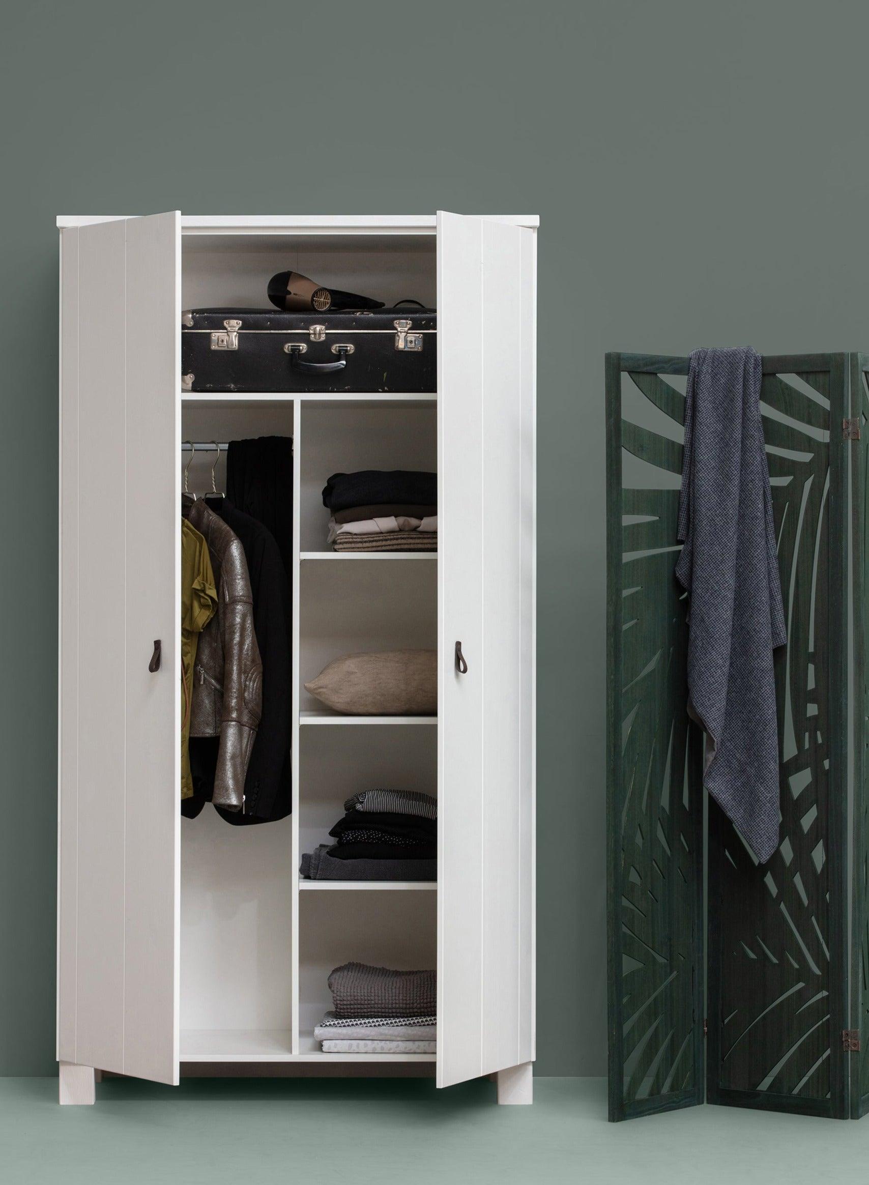 Biela skriňa Ties je vyrobená z borovicového dreva, ktoré jej zabezpečuje dlhú životnosť a odolnosť. Dvoje dverí sa ľahko otvárajú a odhaľujú úložný priestor, ktorý je dostatočne priestranný na to, aby sa doň zmestilo všetko, čo potrebujete - od oblečenia po posteľnú bielizeň či uteráky.