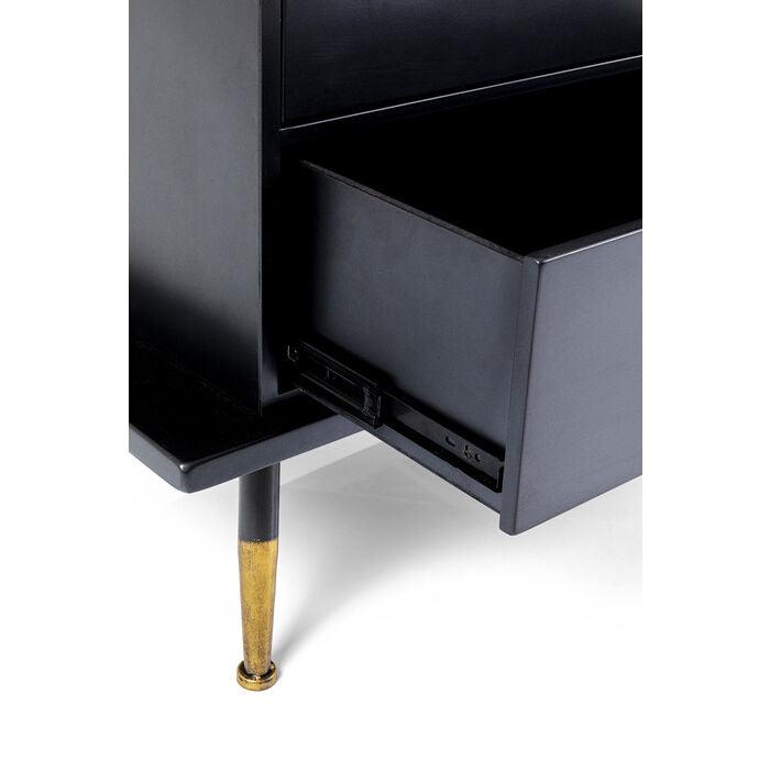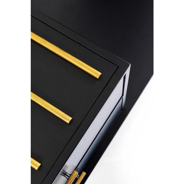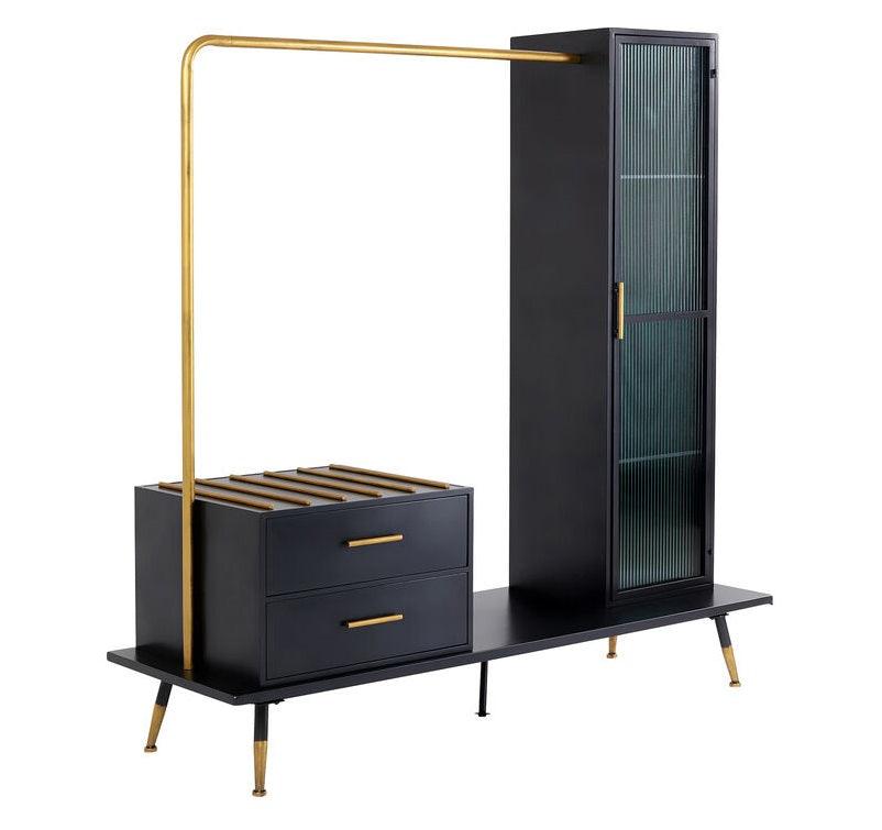 Vyberaný šatník s kombináciou materiálov v podobe dreva, ocele a skla. Prekvapivo funkčný šatník v modernom loftovom štýle, čierny so zlatými akcentmi. Usporiadava predsieň vďaka dvom zásuvkám, vešiaku na oblečenie a štyrom priehradkám. Pevné materiály, ako je bezpečnostné sklo, robia šatník odolným. Tento elegantný šatník je čiastočne ručne vyrobený.