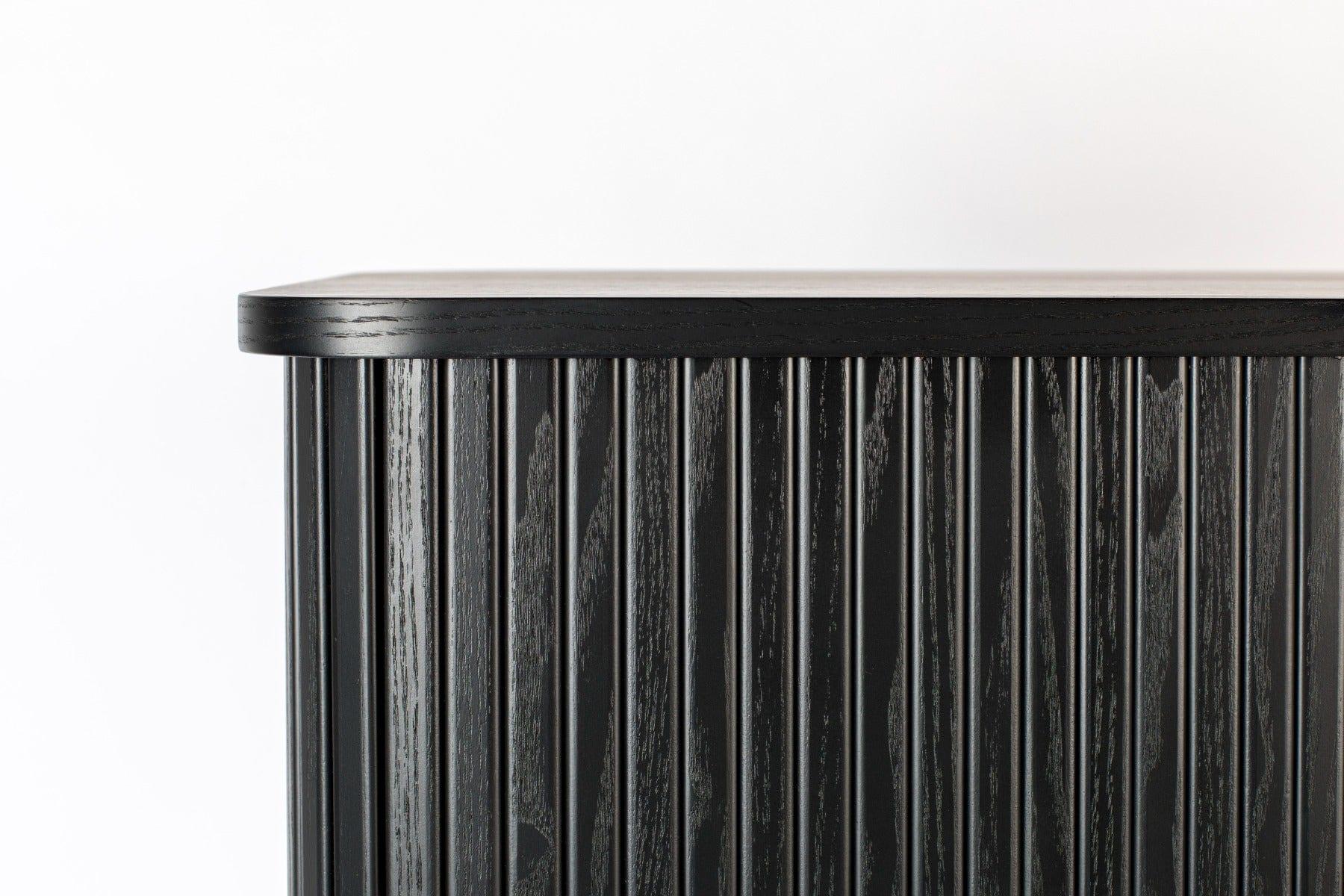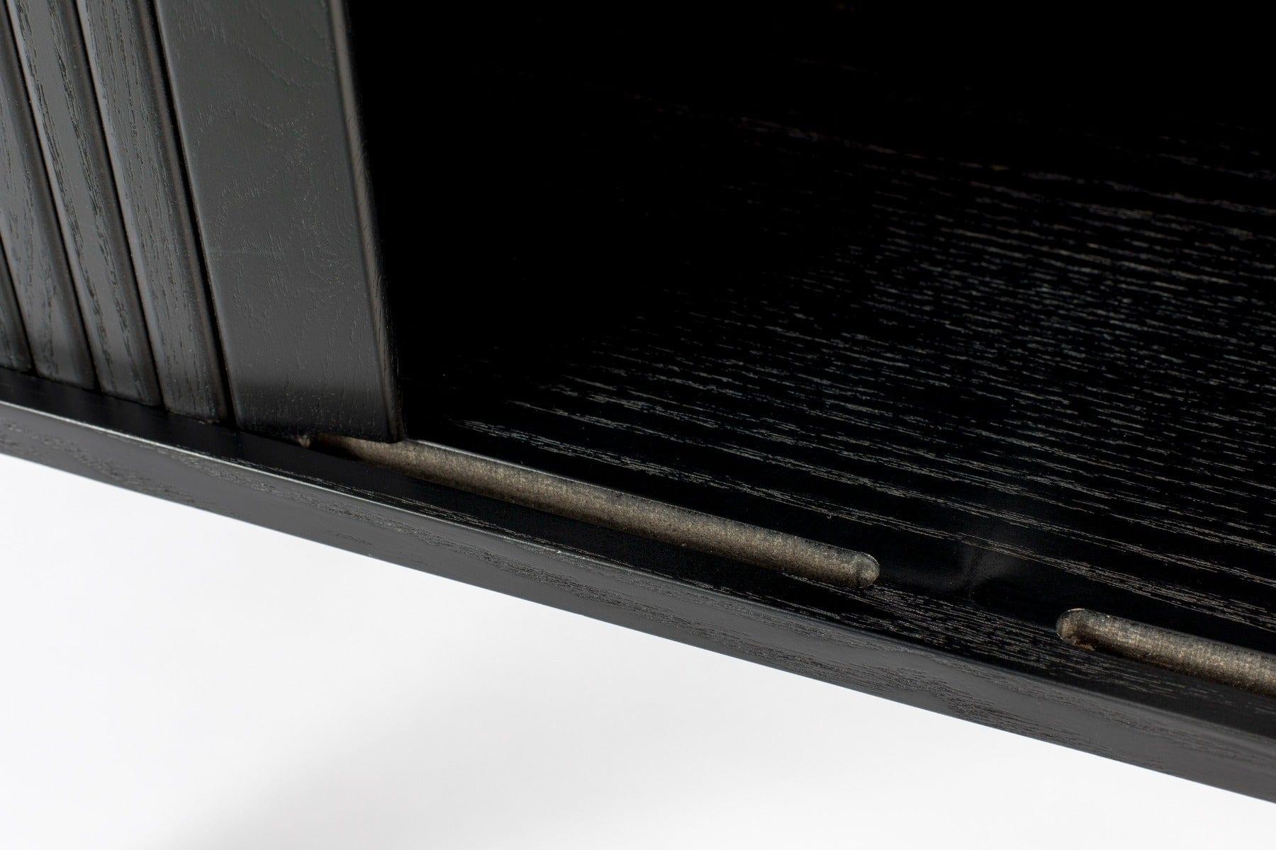 Płyta MDF fornirowana czarnym dębem 18 mm na górze i na dole, Dwa żaluzje i nogi z litego drewna kauczukowego (Ø 45 mm, bezbarwny lakier poliuretanowy, MDF z folią wewnątrz)