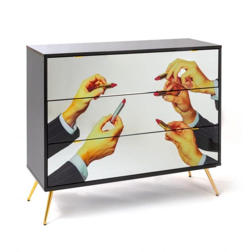 Designerská skrinka je ďalší projekt talianskeho kráľa avantgardy — Seletti, ktorá ako brána do iného, surrealistického rozmeru, dodá interiéru jedinečný charakter. Sklenené predné strany skrinky sa vyznačujú výrazným, dynamickým a mierne kontroverzným kolážom, ktorý vytvára originálne umelecké dielo.