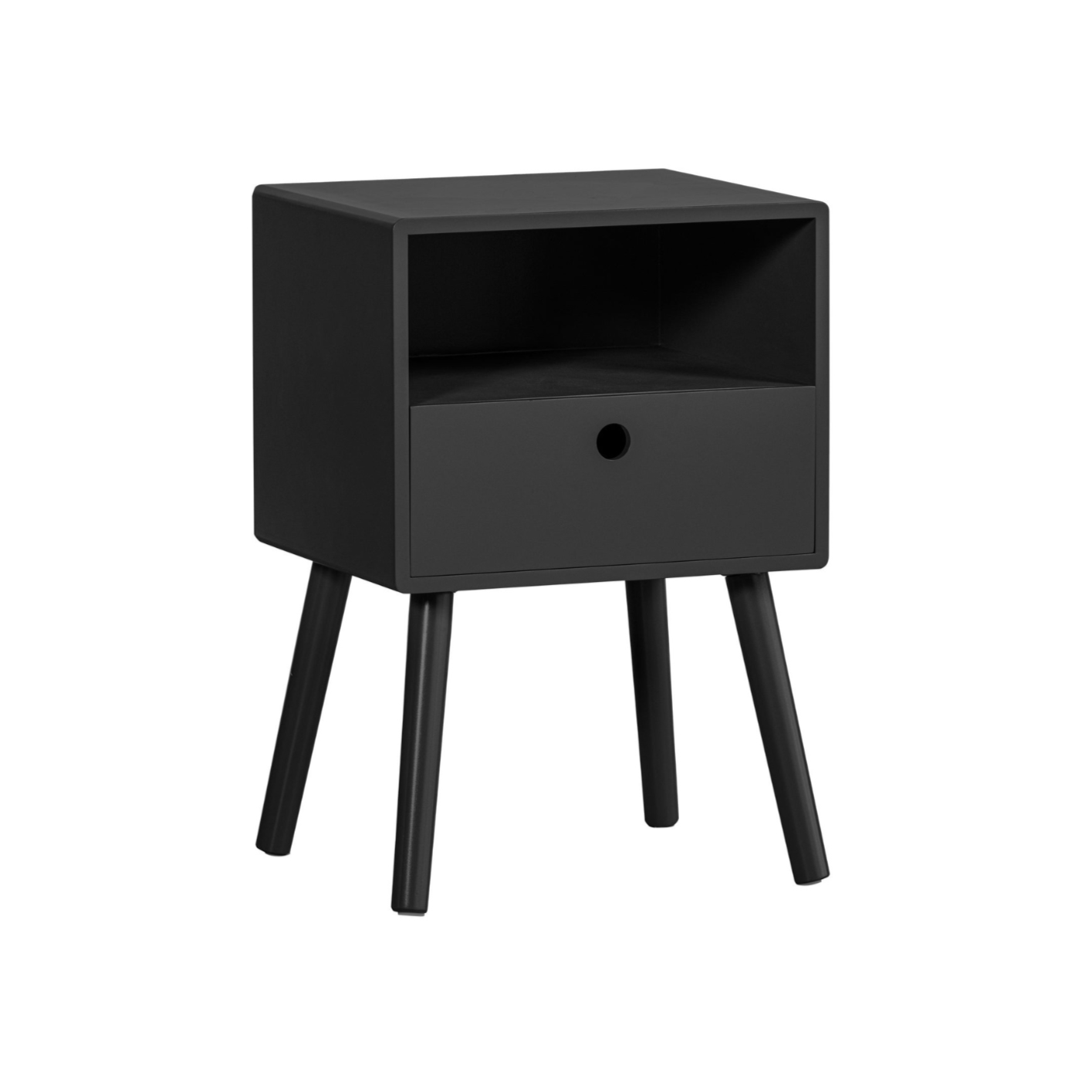 Čierna nočná skrinka Ozzy sa dokonale hodí ako diskrétny, ale štýlový doplnok do spálne – skvelá na uskladnenie kníh, nabíjačky alebo nočnej lampy.