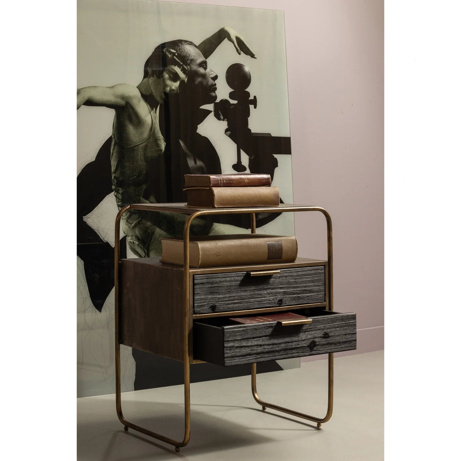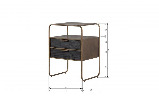 Metalová konštrukcia s povrchovou úpravou v odtieni antického mosadze dodáva nábytku vznešený vzhľad a nádych vintage. Dve plytké zásuvky z dreva s čiernym náterom a jasne vyznačenou štruktúrou dodávajú celku surovosť a zdôrazňujú výnimočnosť spracovania.
