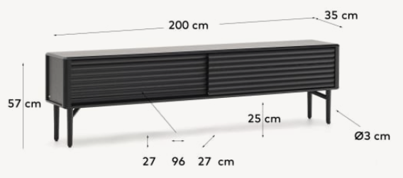 Televízna skrinka Lenon je elegantný kus nábytku vyrobený z masívneho dubového dreva s čiernym moreným povrchom, ktorý spája moderný dizajn s funkčnosťou. Vybavená 2 posuvnými dverami a nastaviteľnými nožičkami, skrinka zabezpečuje jednoduchý prístup a prispôsobenie rôznym povrchom.