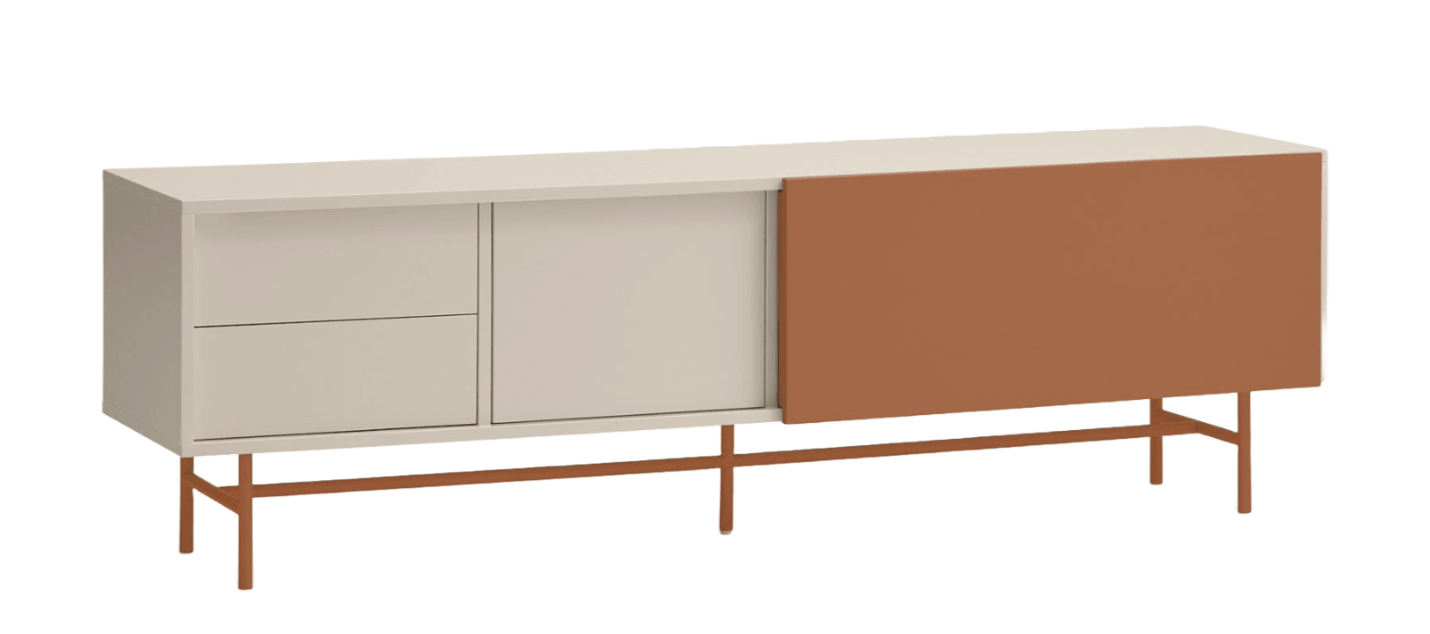RTV skrinka v jedinečnej farbe škoricovo béžovej. Kolekcia Nube sa vyznačuje mimoriadnou a výraznou konfiguráciou vďaka posuvným dverám, ktoré je možné nastaviť podľa individuálnych preferencií. Spôsob, akým sa tieto dvere posúvajú po RTV skrinke Nube, odhaľujúc a skrývajúc rôzne časti jej interiéru, čerpá inšpiráciu zo spôsobu, akým sa oblaky pohybujú po oblohe.