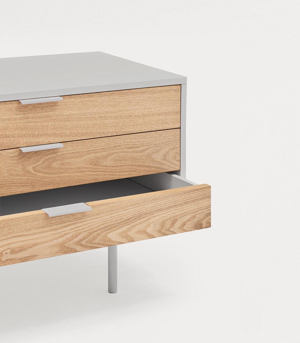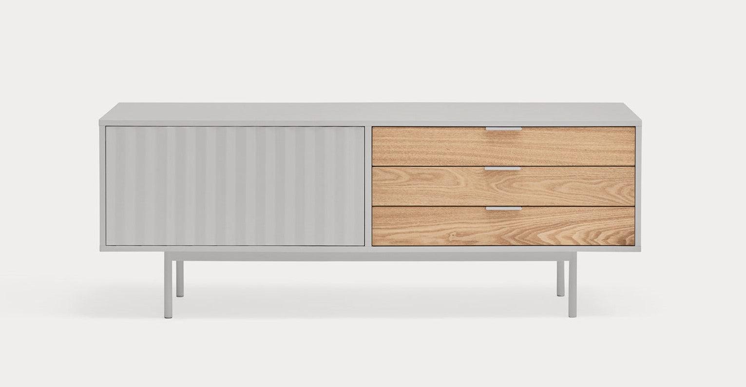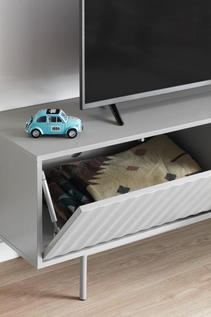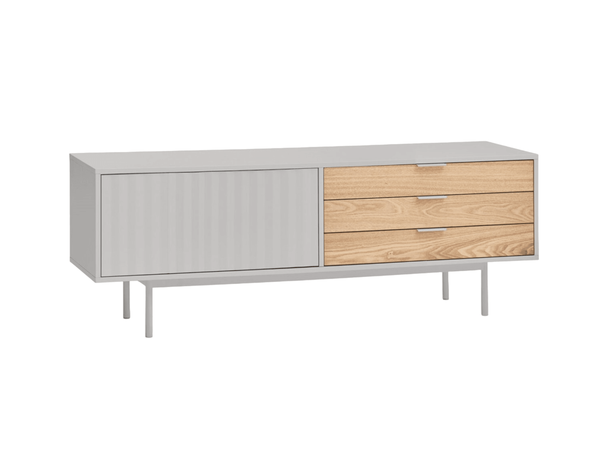 Televízna skrinka so zásuvkami Sierra v šedej farbe je funkčné a elegantné riešenie pre váš obývací priestor. Má zúbkované dvierka a tri zásuvky z prírodného dreveného dyhy, ktoré umožňujú efektívne organizovanie priestoru na uskladnenie rôznych predmetov.