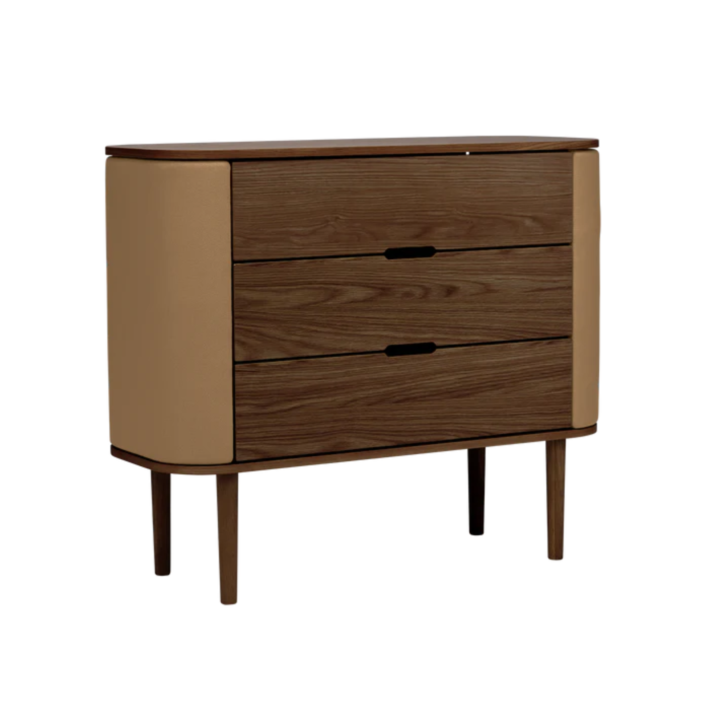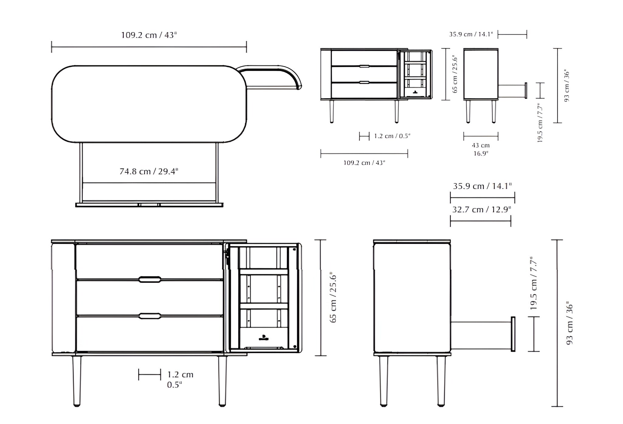 Treasure Komoda je elegantná a funkčná skriňa, ktorá spája jemné krivky s praktickým úložným priestorom. Za zaoblenými bočnými dvierkami, ktoré sa otvárajú ako krídla, sa skrýva miesto na šperky a drobné predmety. Tri priestranné zásuvky bez úchytiek poskytujú priestor na svetre, stolový servis alebo kancelárske doplnky.