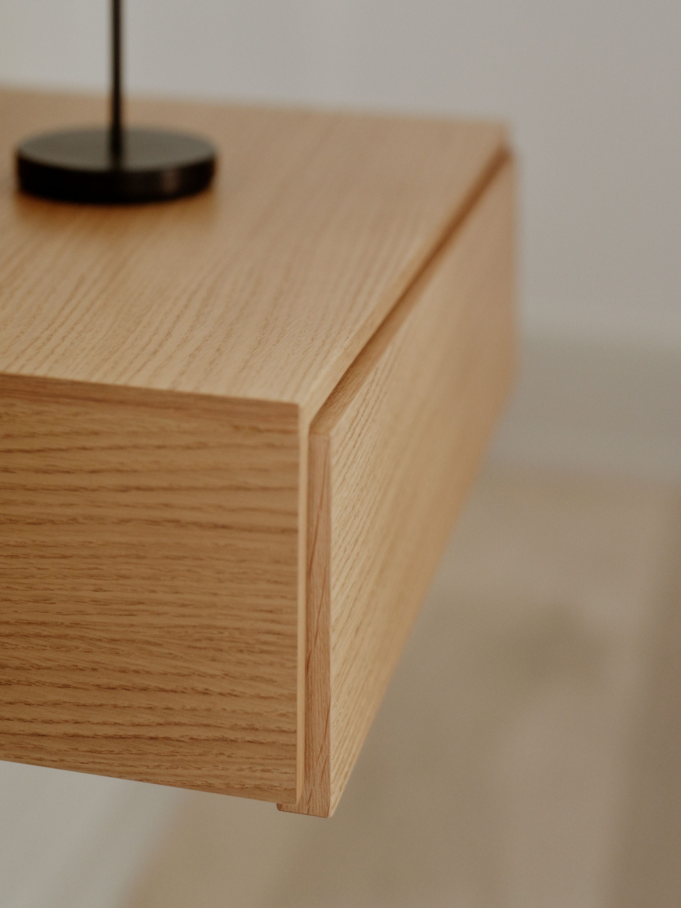 Vyrobená z kvalitného dubového dyhy, skrinka sa skladá z dvoch plôch – horizontálnej, ktorá poskytuje funkčný priestor na uskladnenie predmetov, a vertikálnej, ktorá vytvára jemné pozadie, zdôrazňujúce vystavené prvky. Vďaka svojej nadčasovej estetike sa skvele hodí ako samostatný kus nábytku, tak aj ako súčasť väčšej aranžácie.