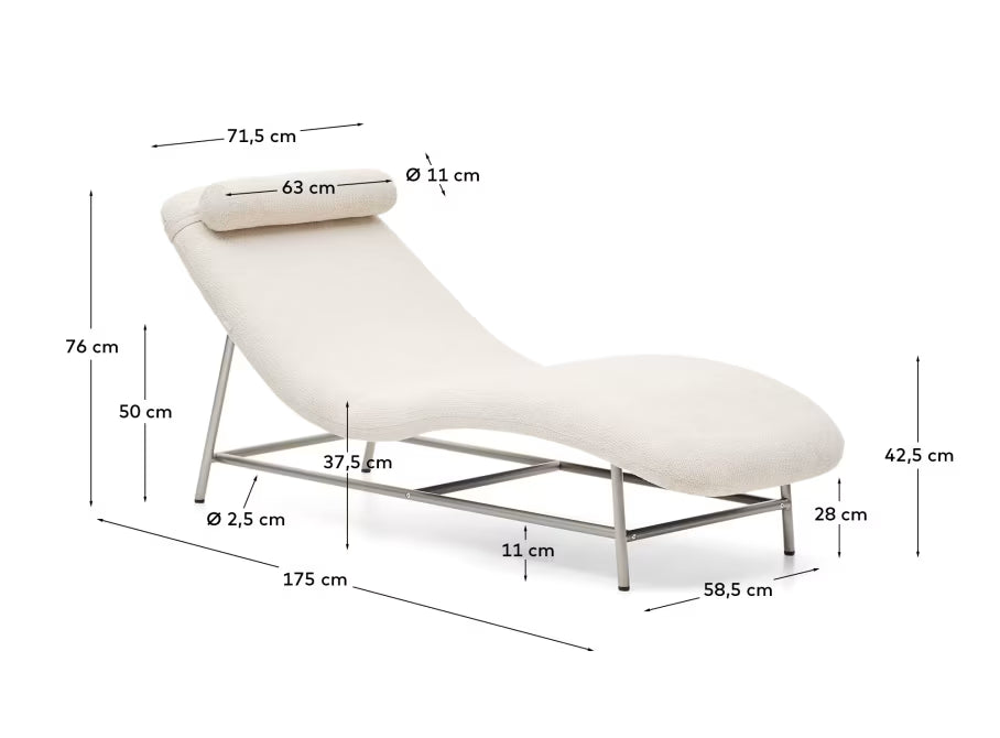 Szezlong posiada ramę z drewna bukowego, sosnowego i sklejki niskoemisyjnej E0. Tapicerka szenilowa z poliestru o gramaturze 420 g/m² wyróżnia się odpornością na ścieranie >40.000 cykli Martindale, wysoką odpornością na pilling (4 – bardzo dobry) oraz dobrą odpornością kolorów na światło (4). Siedzisko wypełnia pianka o gęstości 35 kg/m³, zapewniająca optymalne podparcie. Poduszka zagłówka o grubości 11 cm wykonana jest z poliestru i wypełniona włóknem syntetycznym. Nogi ze stali nierdzewnej z rurką 1,8 mm mają szczotkowane wykończenie i regulowane ochraniacze z tworzywa i filcu. Certyfikaty FSC™ i OEKO-TEX® STANDARD 100 potwierdzają ekologiczne i odpowiedzialne wykonanie mebla.