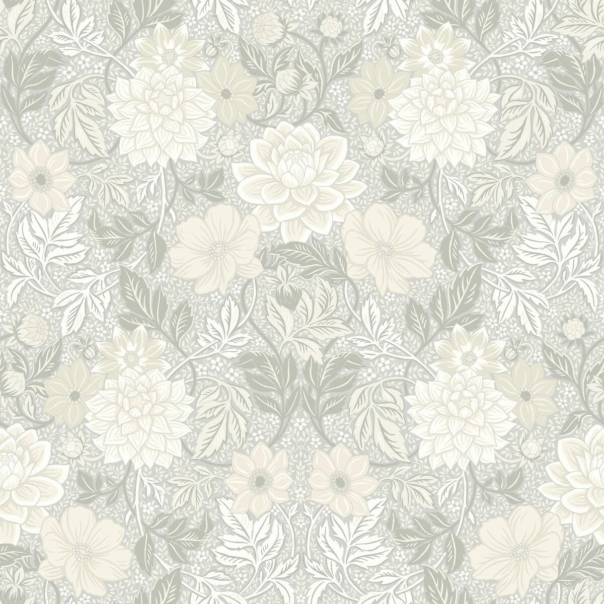 Tapeta z flizelínu s rastlinným vzorom DAHLIA GARDEN šedobéžová s bielou