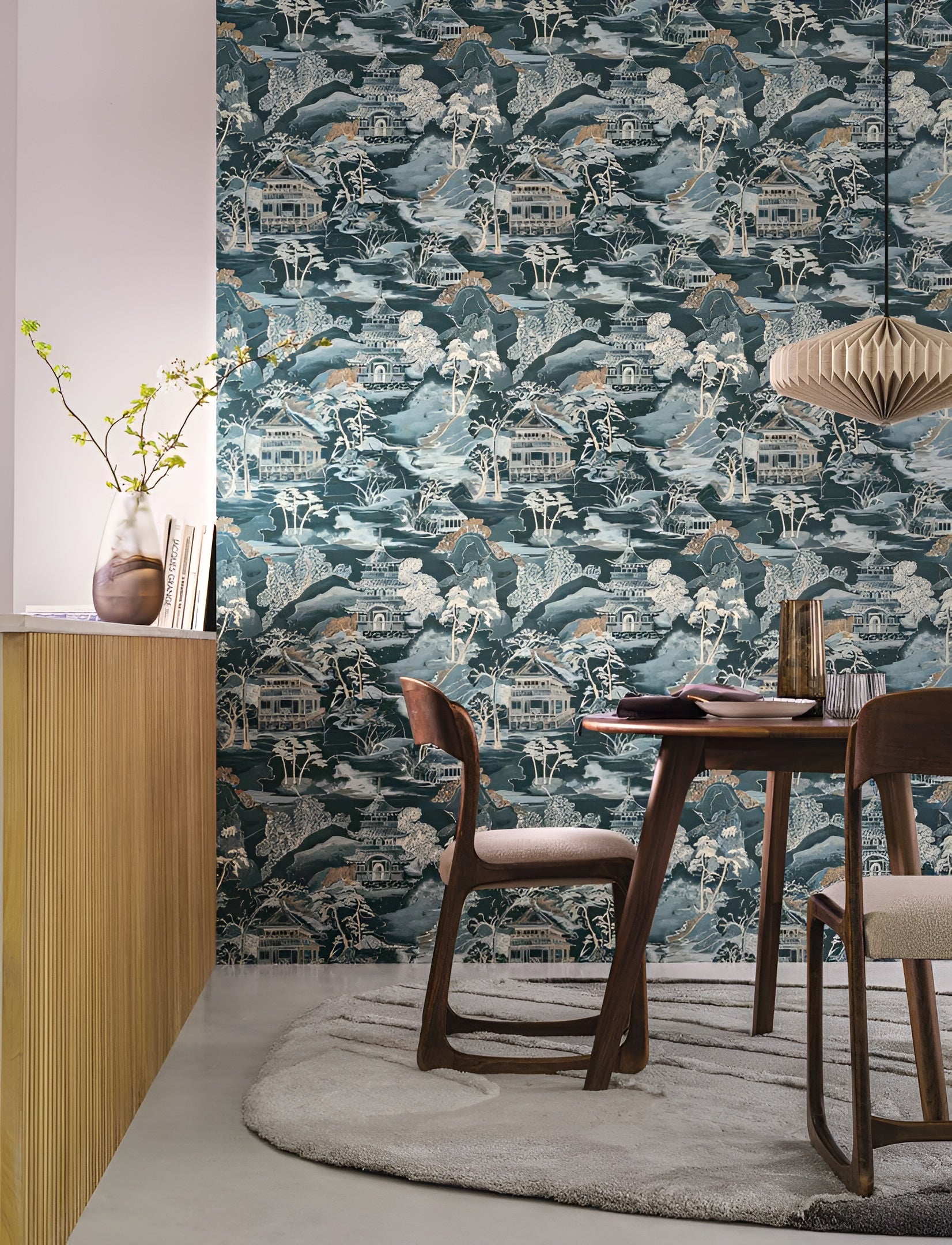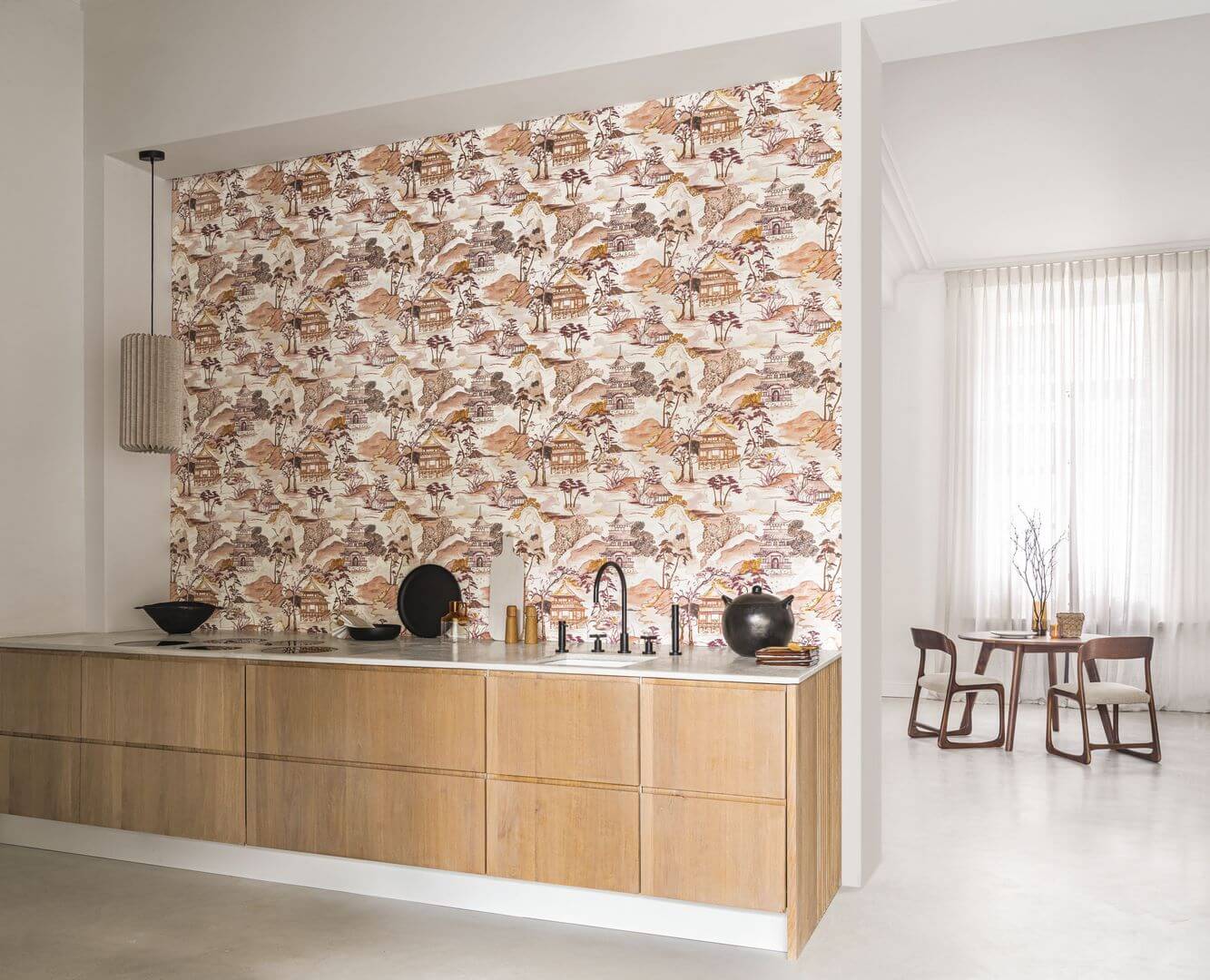 Tapeta štrukturálna s orientálnou krajinou NARA - BLANC/CELADON biela so seledínovou