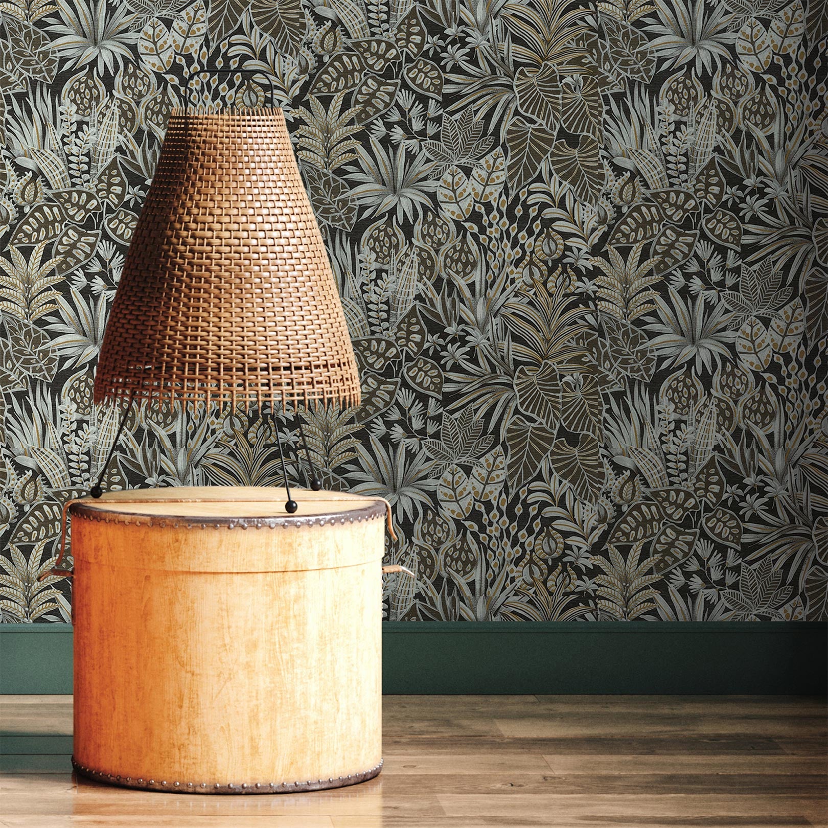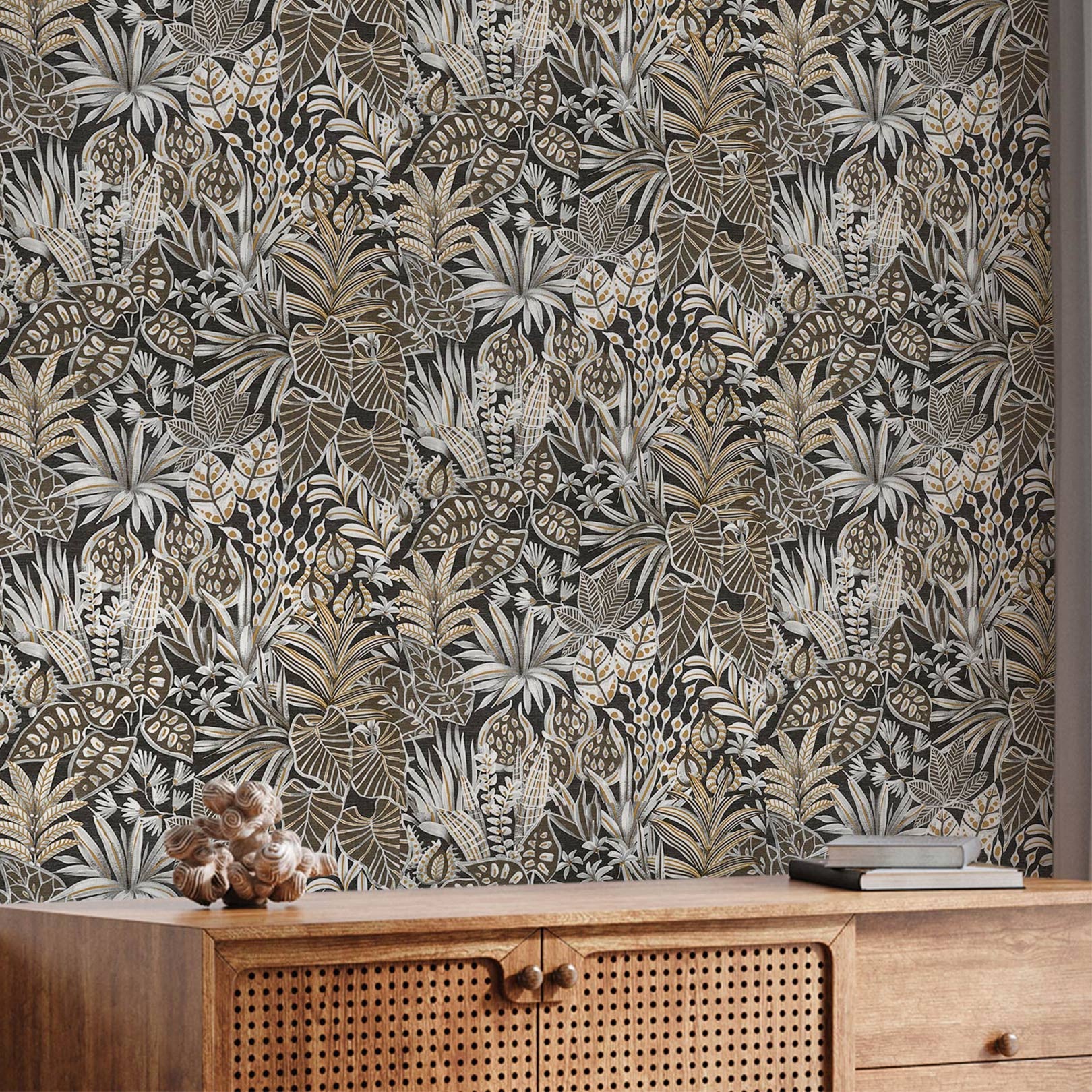 Tapeta so štruktúrou a rastlinným motívom listov MADHUCA - NOIR čierna so zlatou