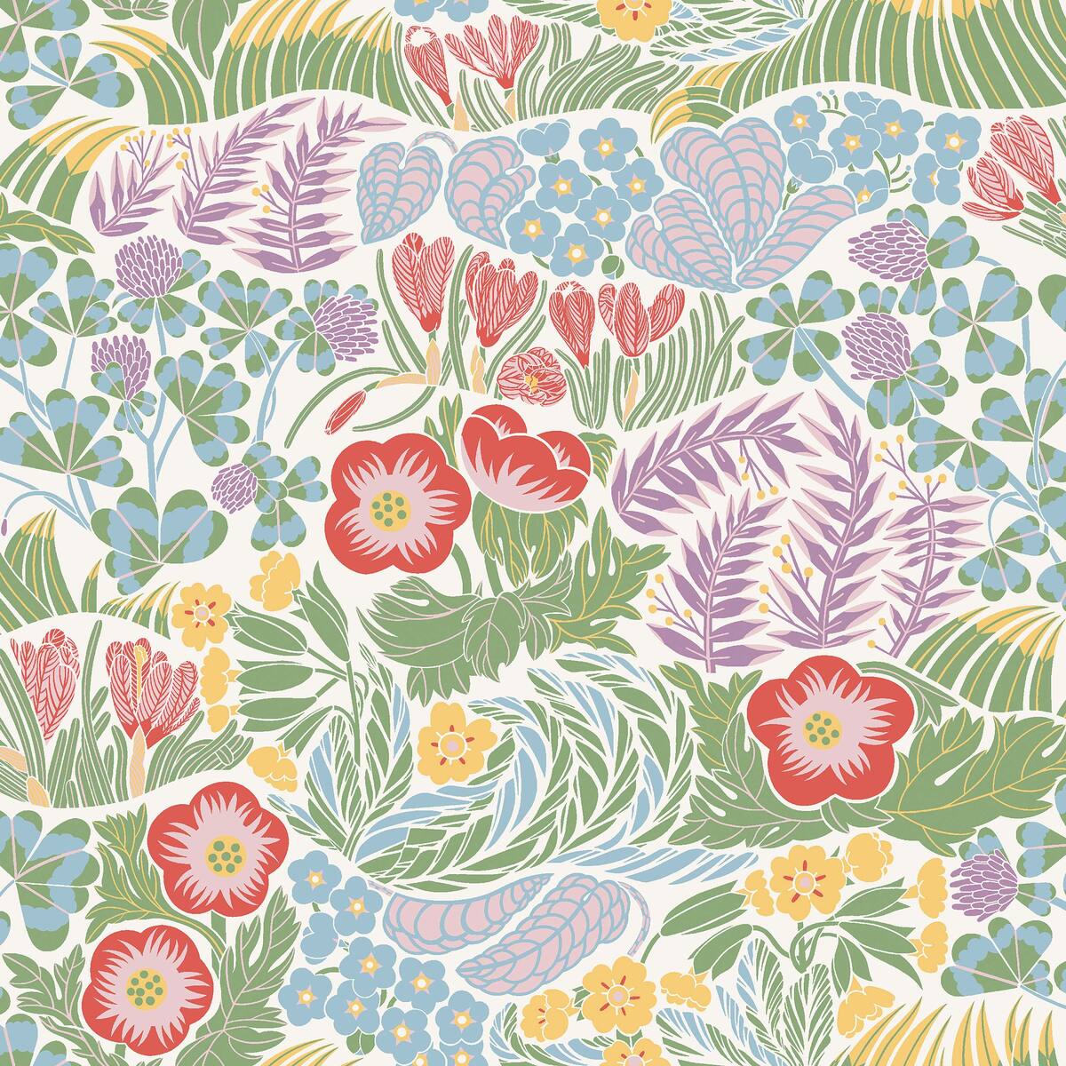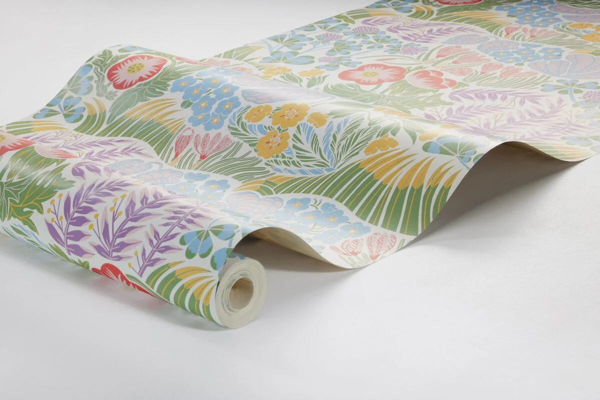 Tapeta Rabatt je výrazný a energický vzor, ktorý vnáša do interiéru radostnú a dynamickú atmosféru. Bohatá paleta farieb, vrátane červenej, zelenej, modrej, žltej a bielej, na čiernom pozadí, vytvára efekt živého, kvitnúceho záhrady plnej tvarovaných kvetov. Vzor inšpirovaný štýlom 60. rokov priťahuje pozornosť a dodáva priestoru moderný, retro charakter.