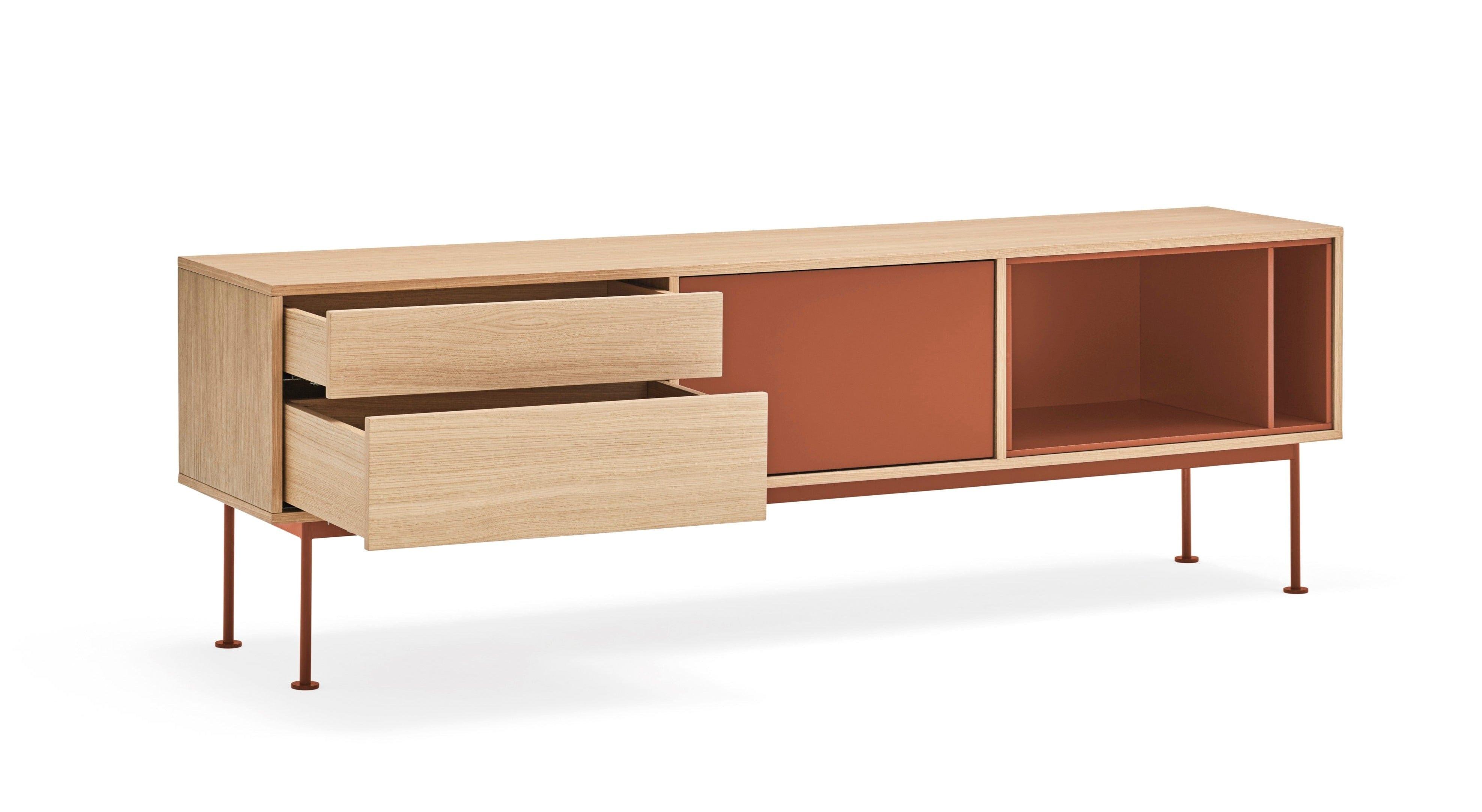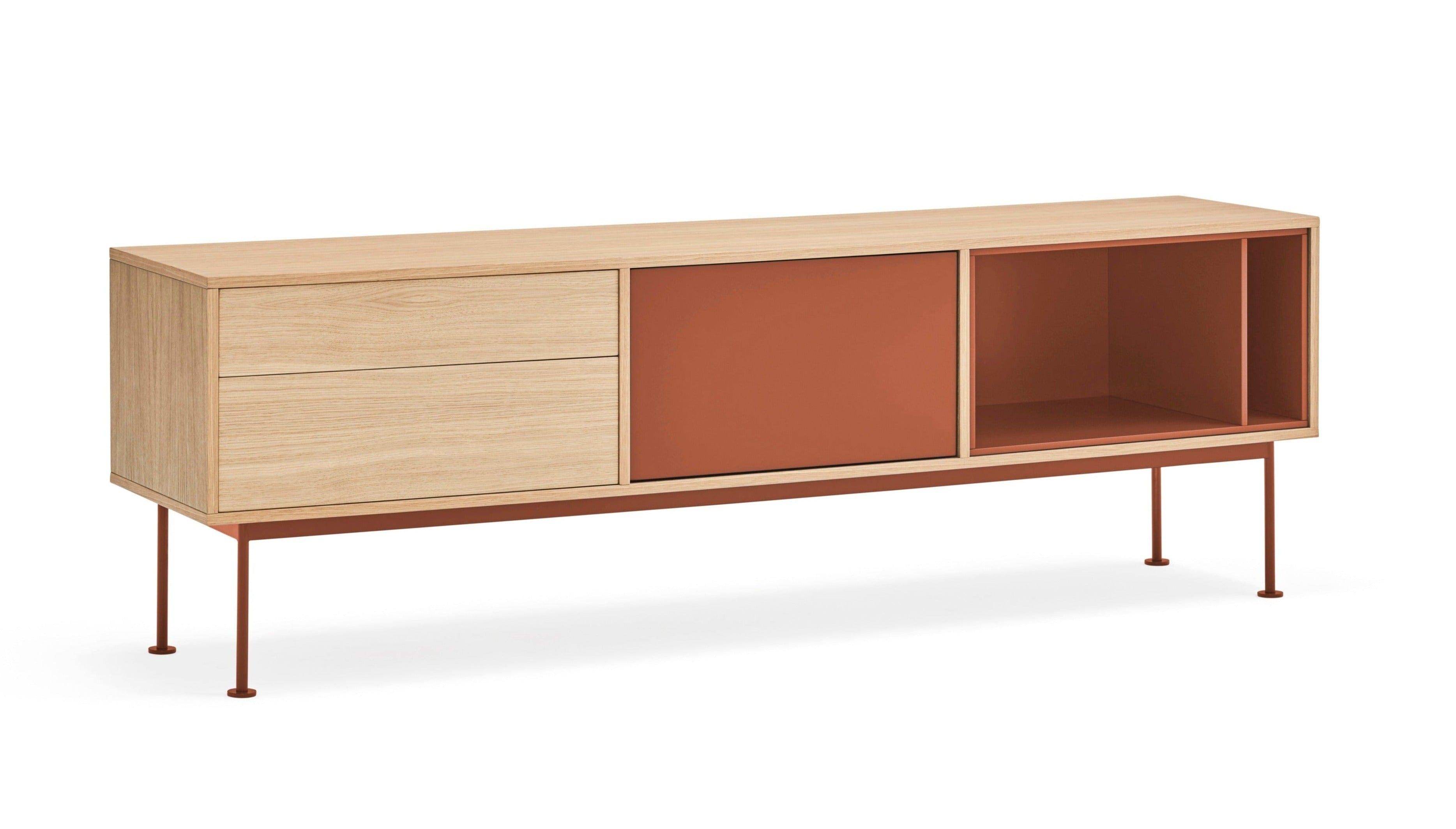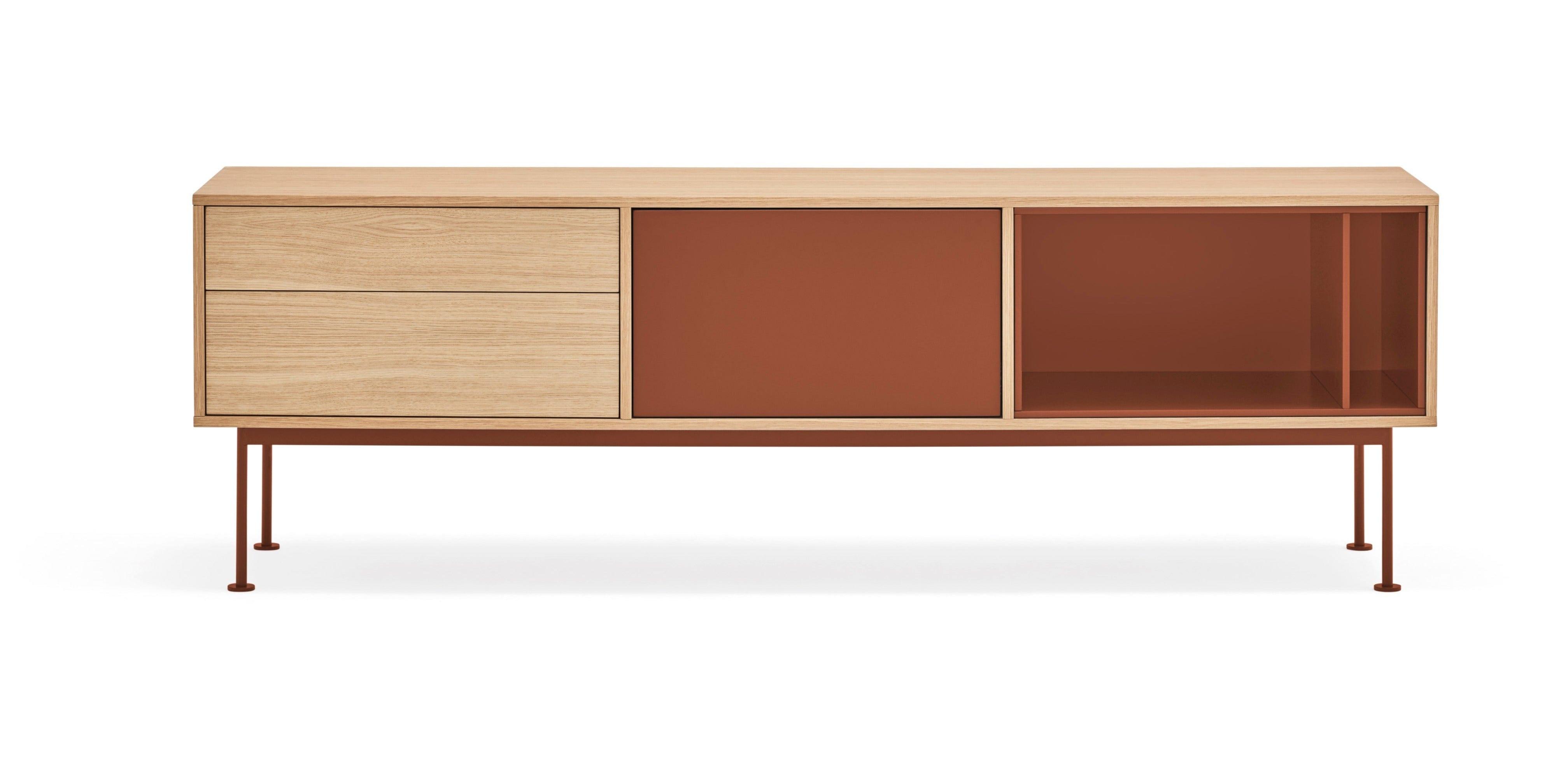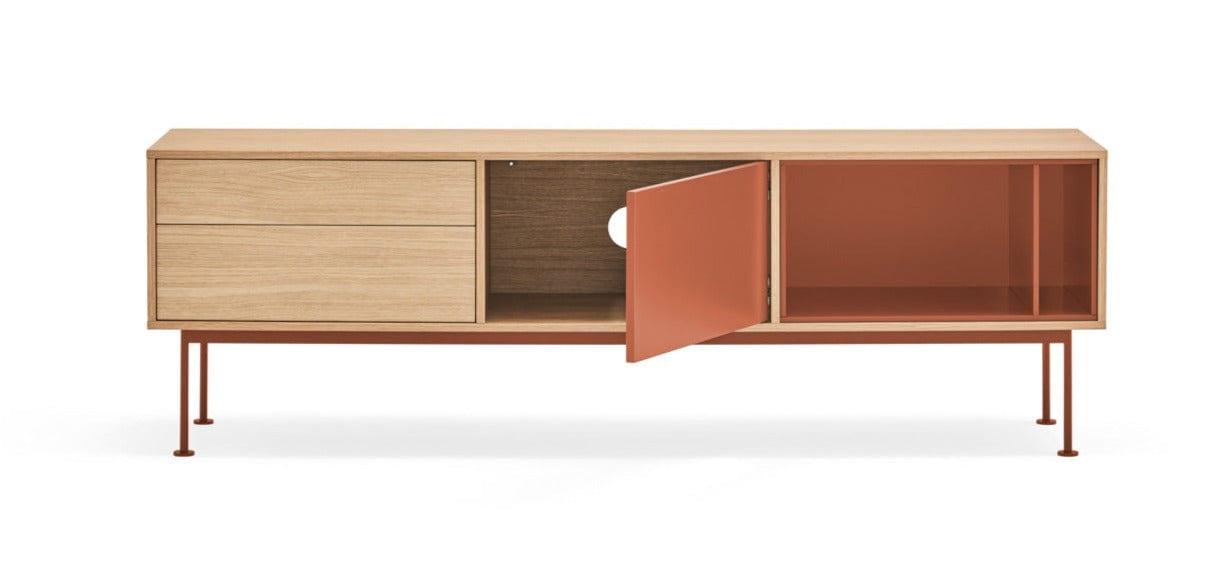 Precízne spracovanie a skvelé cítenie proporcií od dizajnérov španielskej značky Teulat zabezpečili, že si môžete vychutnať toto dielo úžitkového umenia priamo vo svojom obývacej izbe. Kombinácia dreva s intenzívnym odtieňom červenej dodala RTV skrinke povestný šmrnc.