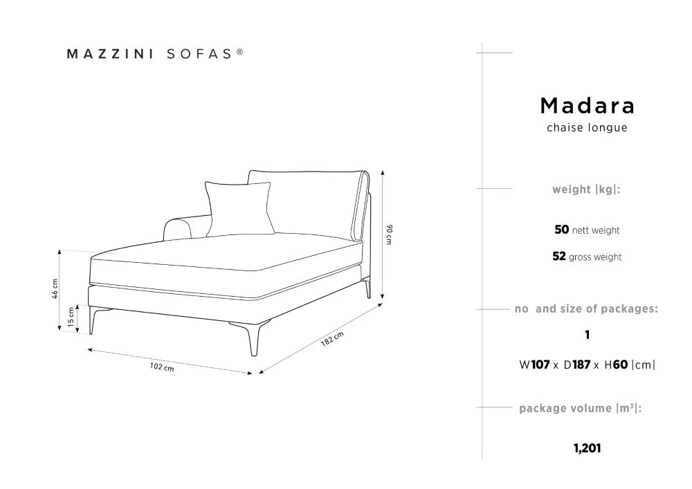 Szezlong Madara je esenciou moderného minimalizmu. Hlboké sedenie v kombinácii s pohodlnými vankúšmi na operadle a praktickými opierkami rúk zaručuje výnimočný komfort pri používaní. Sametový povrch je nielen príjemný na dotyk, ale aj odolný voči oderu, čo minimalizuje riziko poškodenia.