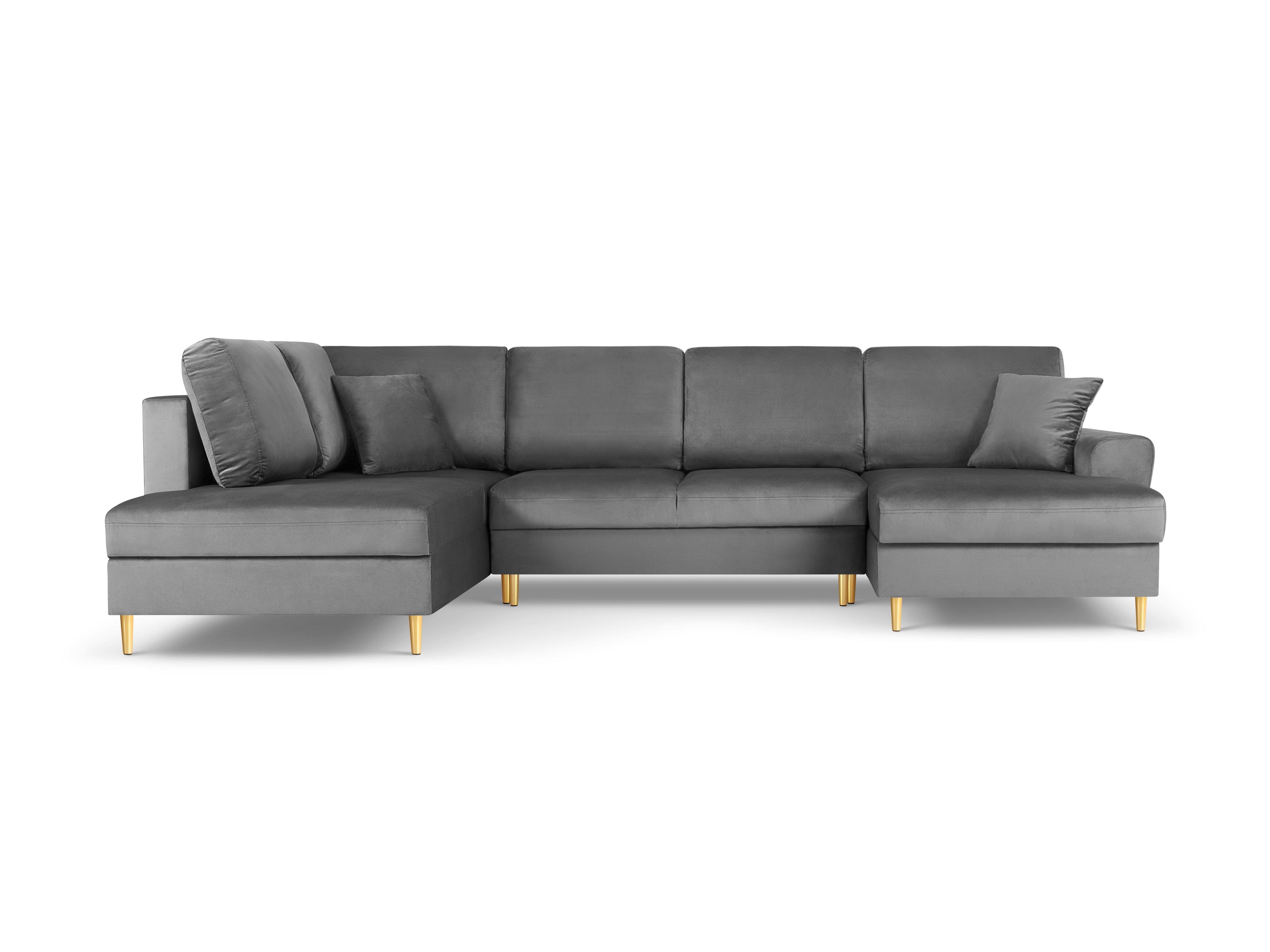 Rohová pohovka s ľavým sedením z sametu panoramatická s funkciou spania KYOTO svetlosivá so zlatým podstavcom
