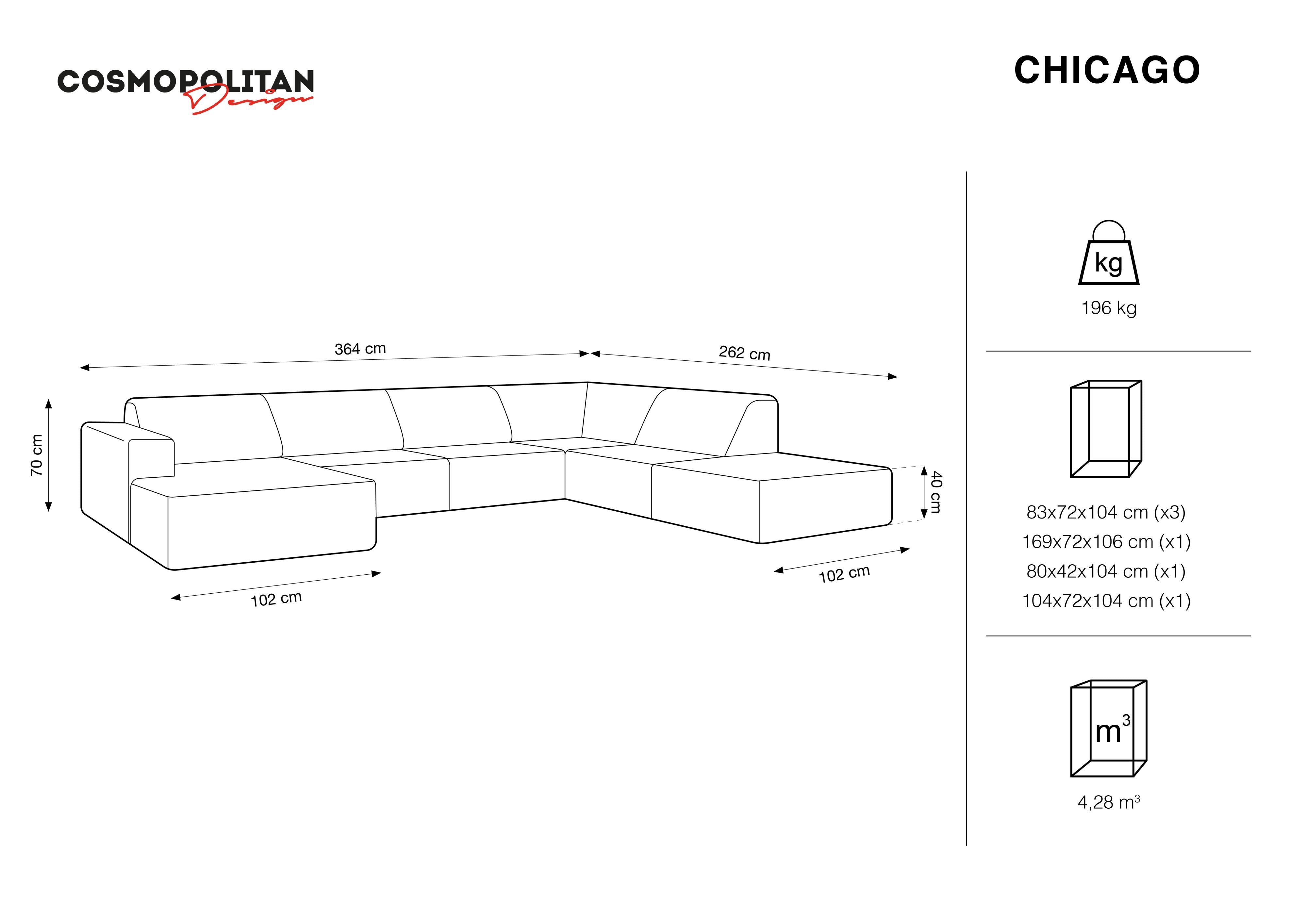 Sametový rohový gauč Chicago sa vyznačuje výnimočným dizajnom, kde jemne prešívané sedadlá a početné prešívania na operadlách dodávajú celku rafinovaný vzhľad. Nízka, rozľahlá konštrukcia vyžaruje mimoriadny šarm, dokonale podčiarkujúc štýl obývacej izby. Elastické, hlboké sedadlá s bohatým vypĺňaním zaručujú nielen komfort, ale aj úplný relax po náročnom dni.