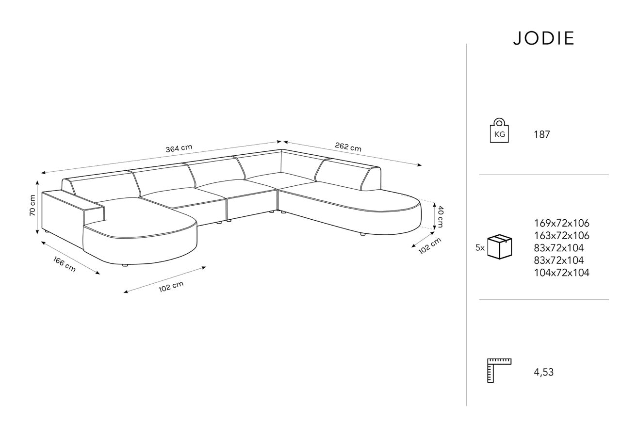 Panoramatická pohovka Jodie je veľmi pohodlná vďaka svojmu veľkému rozmeru, ktorý umožňuje sedenie až siedmim osobám. Navyše má mäkké, pohodlné opierkové a sedacie vankúše, ktoré zabezpečujú komfort pri používaní.